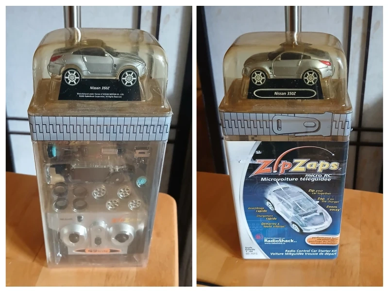 45Selling a RadioShack ZipZaps micro RC car kit featuring a Nissan 350Z model! It's in great shape and comes in the original packaging. The box includes everything you need to get started, including the charger. Zip your car together, zap it on the charger, and zoom away!