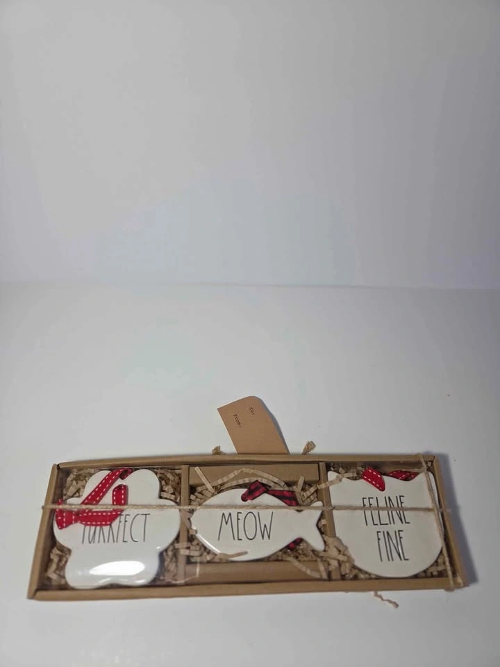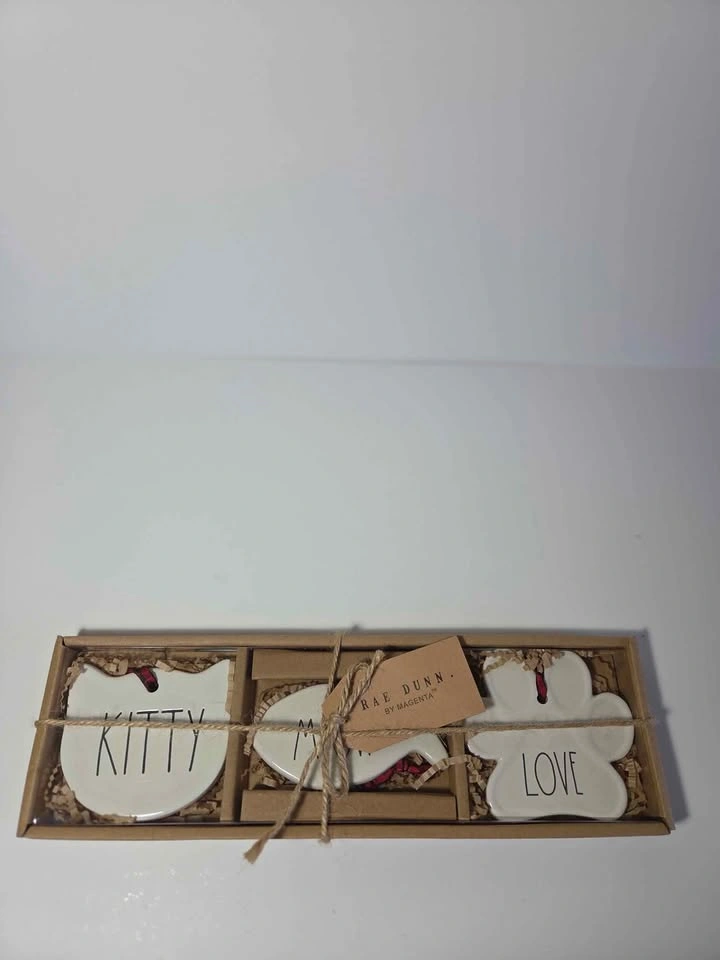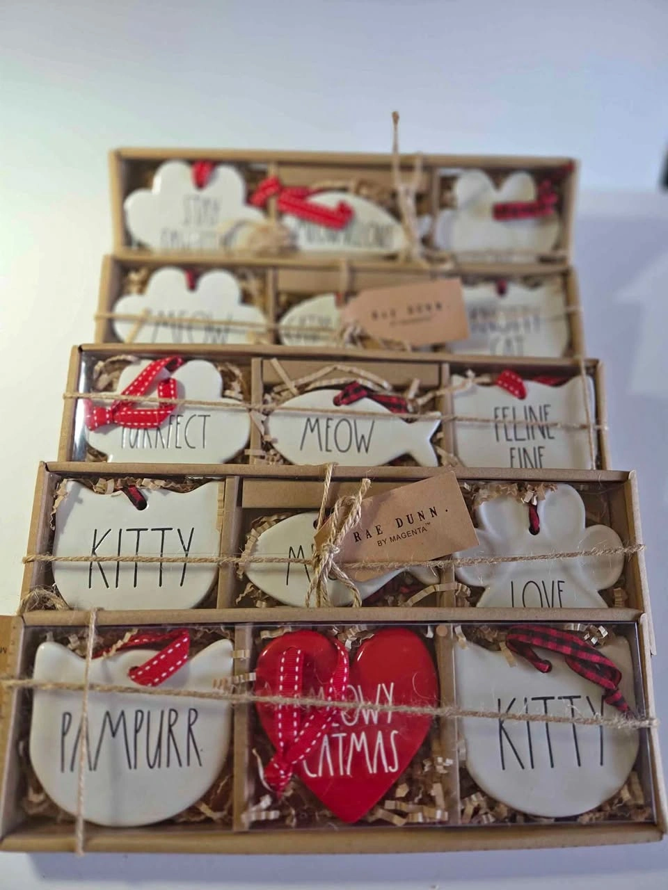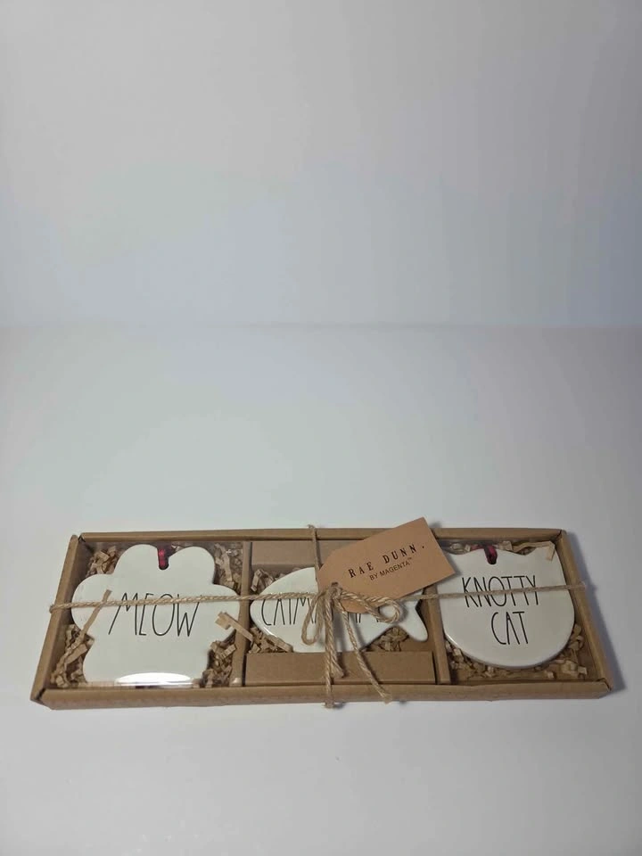 15NEW IN BOX. Rae Dunn by Magenta ceramic cat-themed Christmas ornaments. Each set comes with three unique ceramic ornaments in a gift-ready box (as pictured). Price: $25.00 per set. Quantity Available: 5 sets of 3 ornaments (15 ornaments total). ALL FIVE SETS ARE DIFFERENT: This is a great chance for collectors! Each of the five sets features unique cat-themed words, shapes, and ribbons. Please see the photos for the variety of designs (e.g., "KITTY," "MEOW," "FELINE FINE," "CATMAS," "LOVE," "PURRFECT," and more). Theme: Cat / Kitty Lover / Christmas / Holiday Style: Rae Dunn signature LL (long letter) font. Perfect gift for a cat mom/dad or a Rae Dunn collector! Pickup Location: 4531 7 Ave SE, Calgary. Home Info: This is a non-smoking home that has two cats. I have many items up for sale so please check out my other listings for clothing, home decor and other unique vintage pieces.