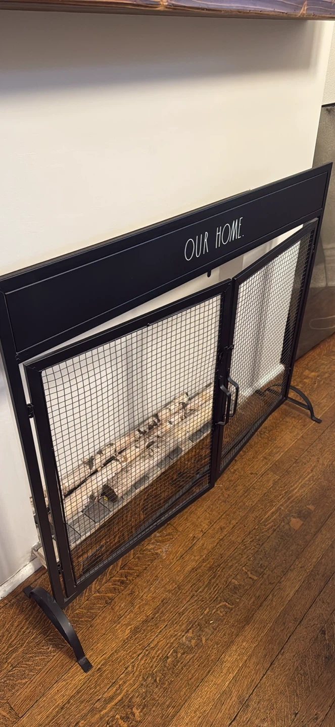 Keep your hearth safe and stylish with this Rae Dunn fireplace screen! The black metal frame features a mesh screen and the words 'Our Home' across the top bar. It's a great way to add a touch of charm to your living room