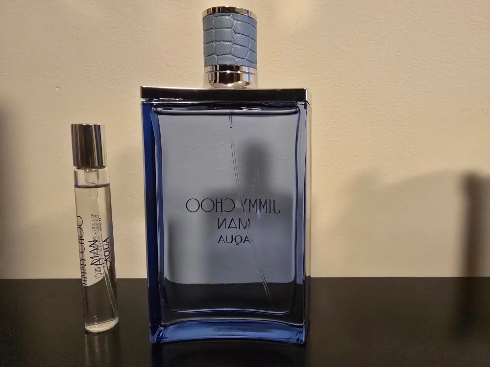 This is a Jimmy Choo Man Aqua Eau de Toilette set. It includes a large bottle and a travel-sized atomizer. The fragrance is aquatic and fresh.