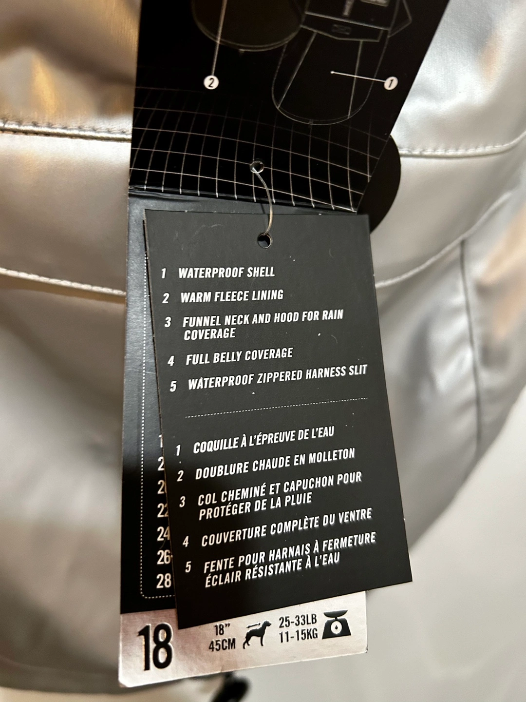 Silver raincoat with a hood and zippered harness slit. Size 18, 18 inches, 45 cm, 25-33 lb, 11-15 kg.