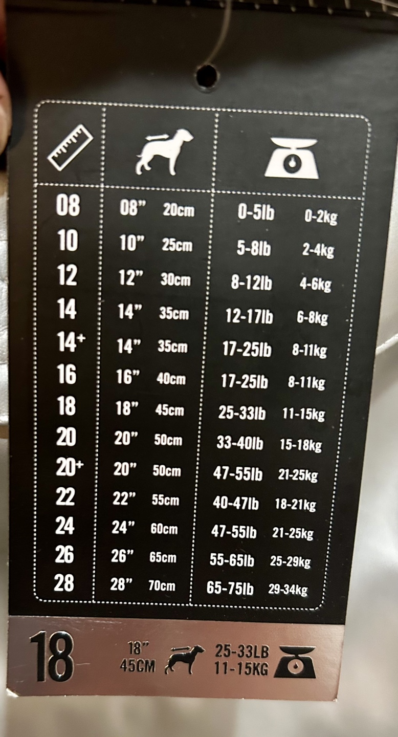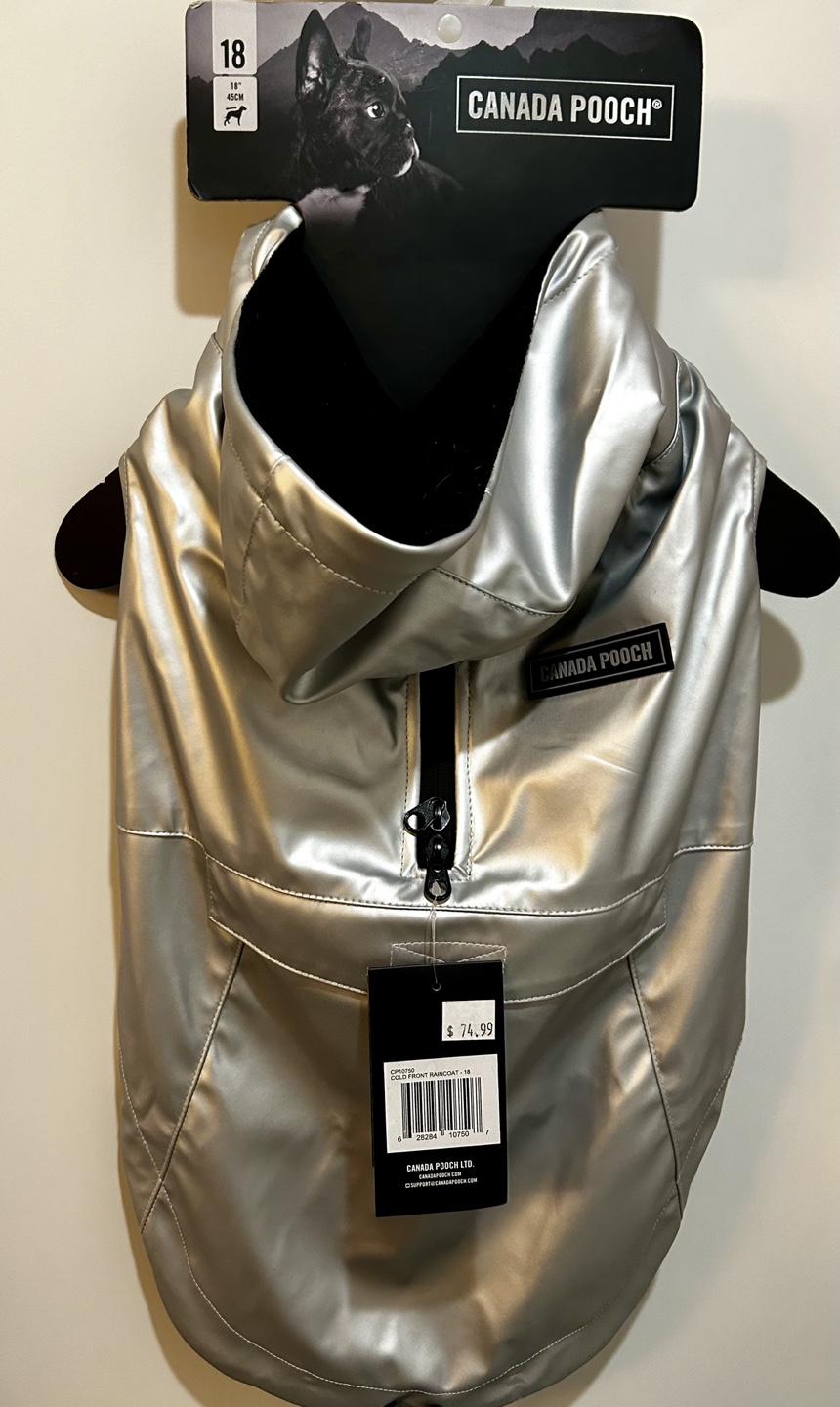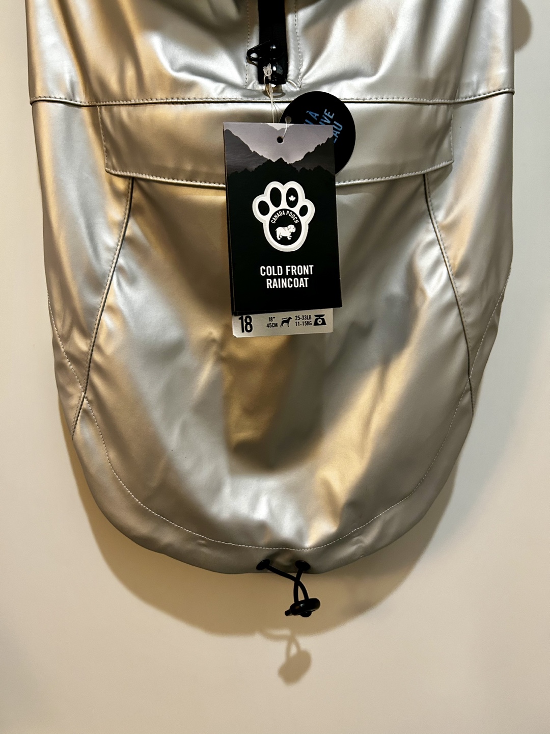 Silver raincoat with a hood and zippered harness slit. Size 18, 18 inches, 45 cm, 25-33 lb, 11-15 kg.