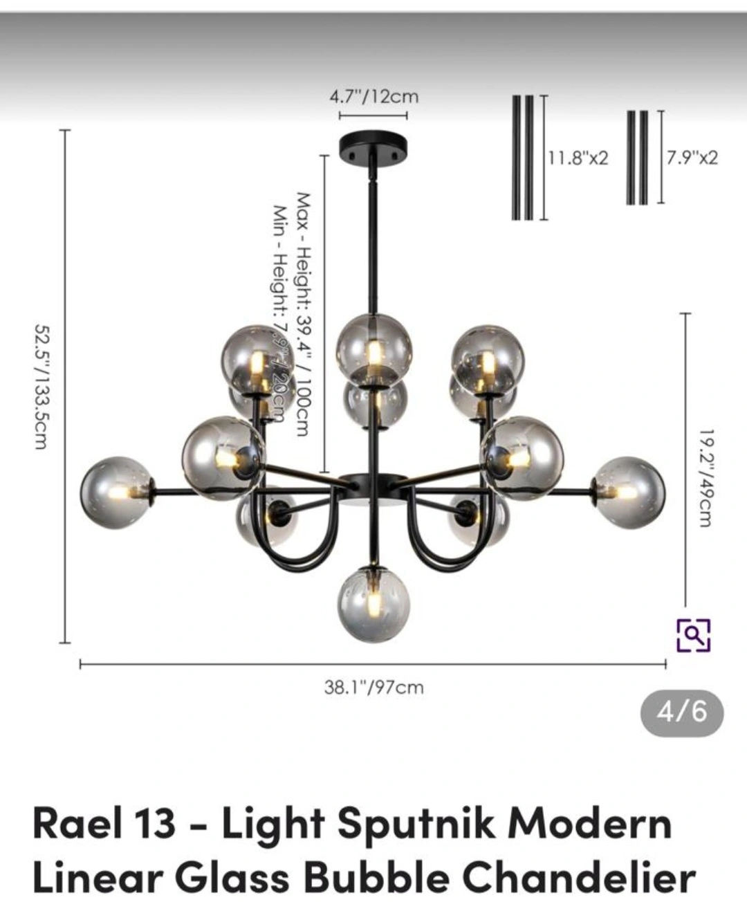 10Selling a Rael 13 Light Sputnik Modern Linear Glass Bubble Chandelier! It's in new condition and comes with the original box. The chandelier features a modern design with glass bubble accents. Dimensions are: 52.5"/133.5cm in height, 38.1"/97cm in width, and has adjustable height from min 7.4"/20cm to max 39.4"/100cm
