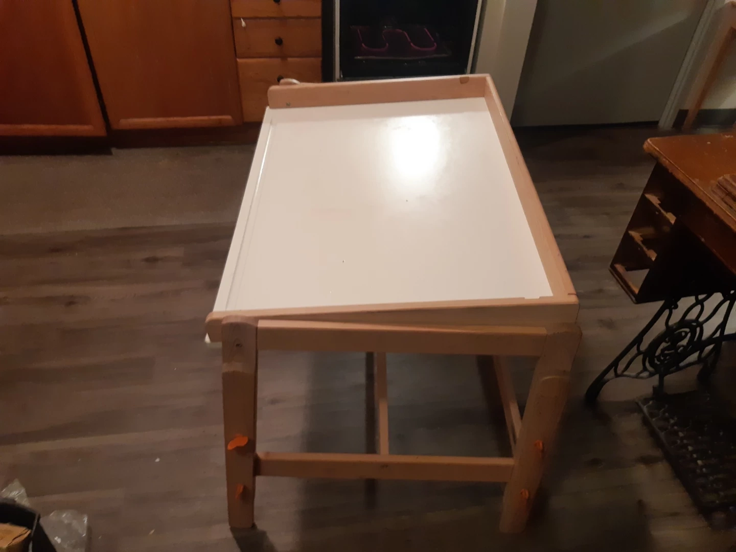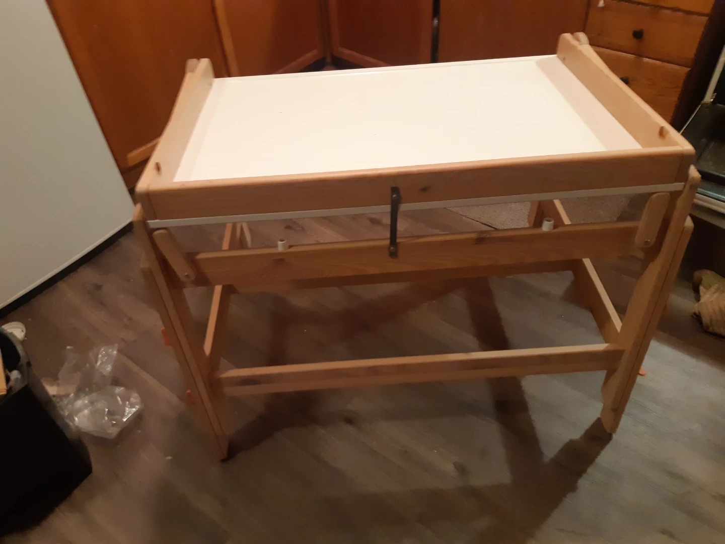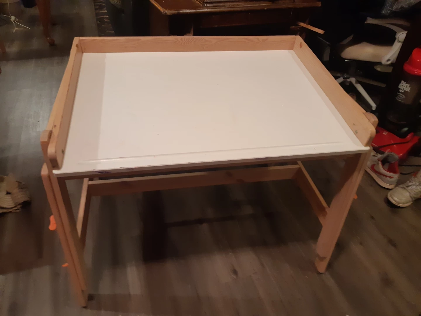 Wooden art easel table for kids. Features a white surface and sturdy wooden frame. It's perfect for creative play and drawing sessions. A fun addition to any playroom!