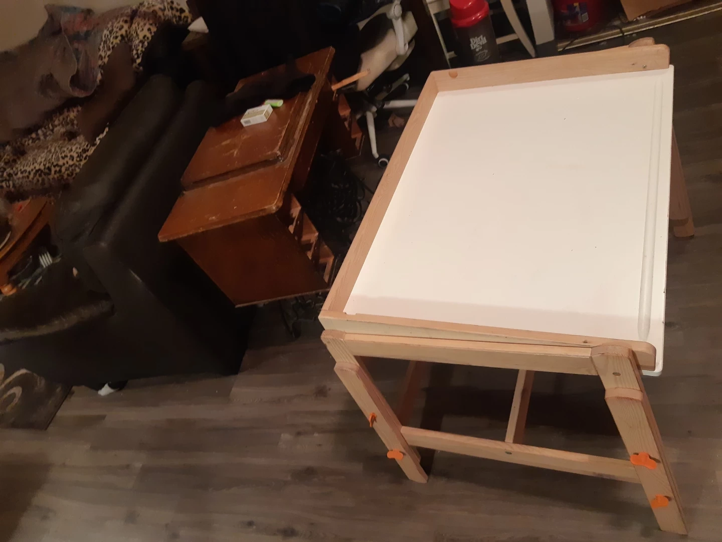 Wooden art easel table for kids. Features a white surface and sturdy wooden frame. It's perfect for creative play and drawing sessions. A fun addition to any playroom!
