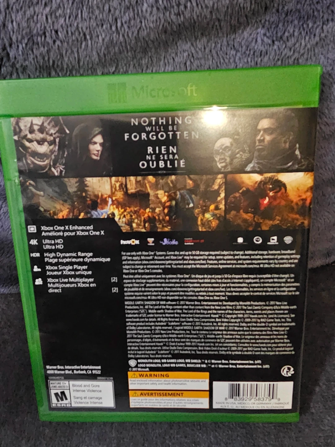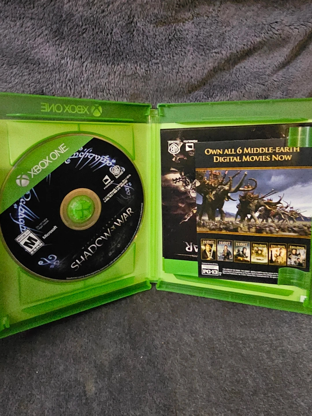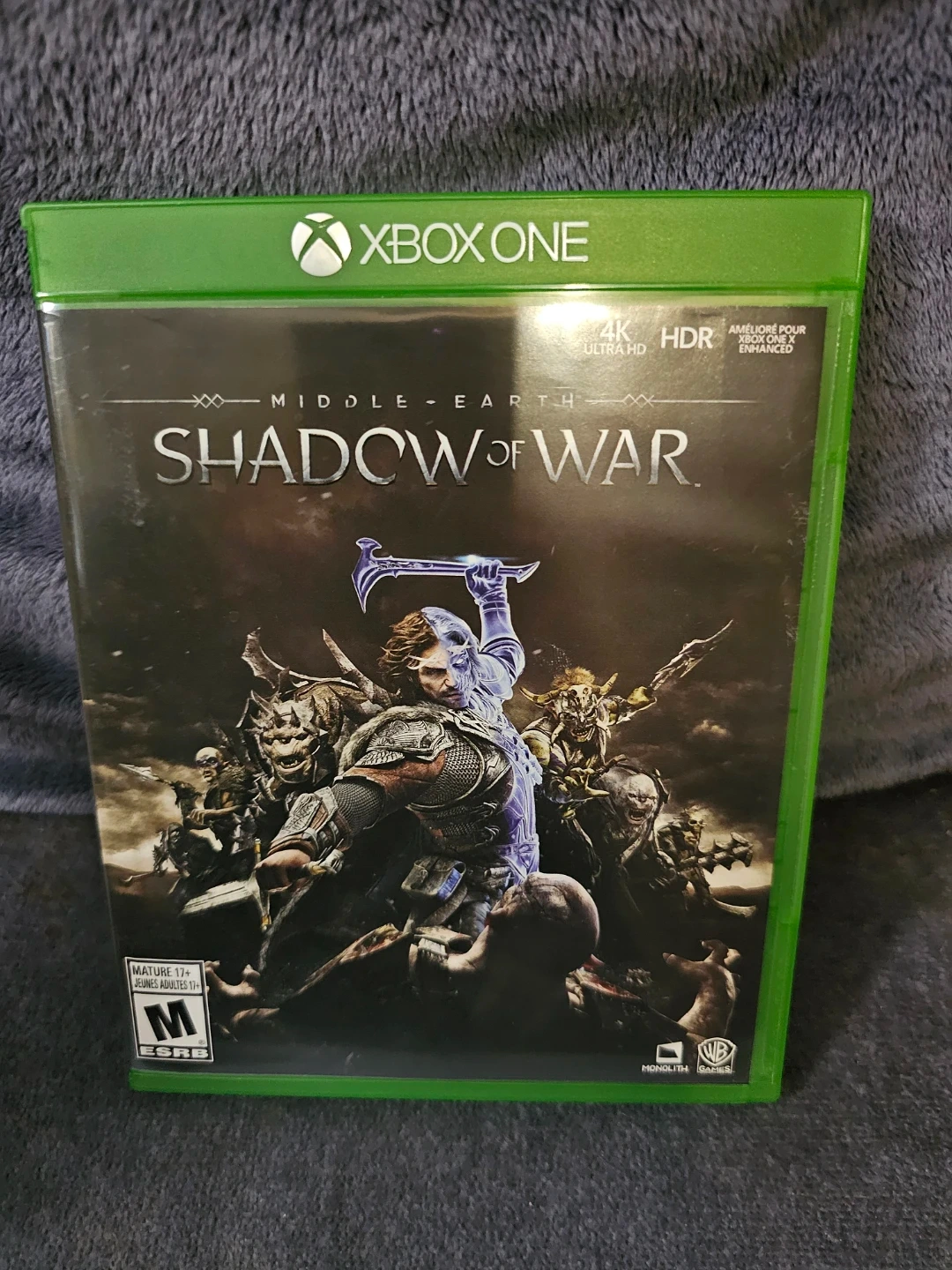 This is the Middle-earth: Shadow of War game for Xbox One. It supports 4K Ultra HD and HDR for enhanced visuals. Disc and case are included.