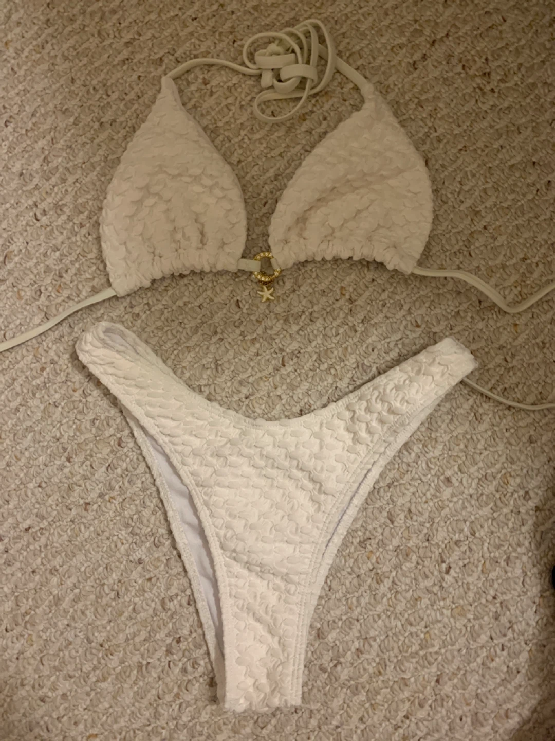 This white bikini set features a textured fabric and a gold-tone starfish charm. The top has adjustable tie straps. It's made with a stretchy material, never used i bought it in the incorrect size :(