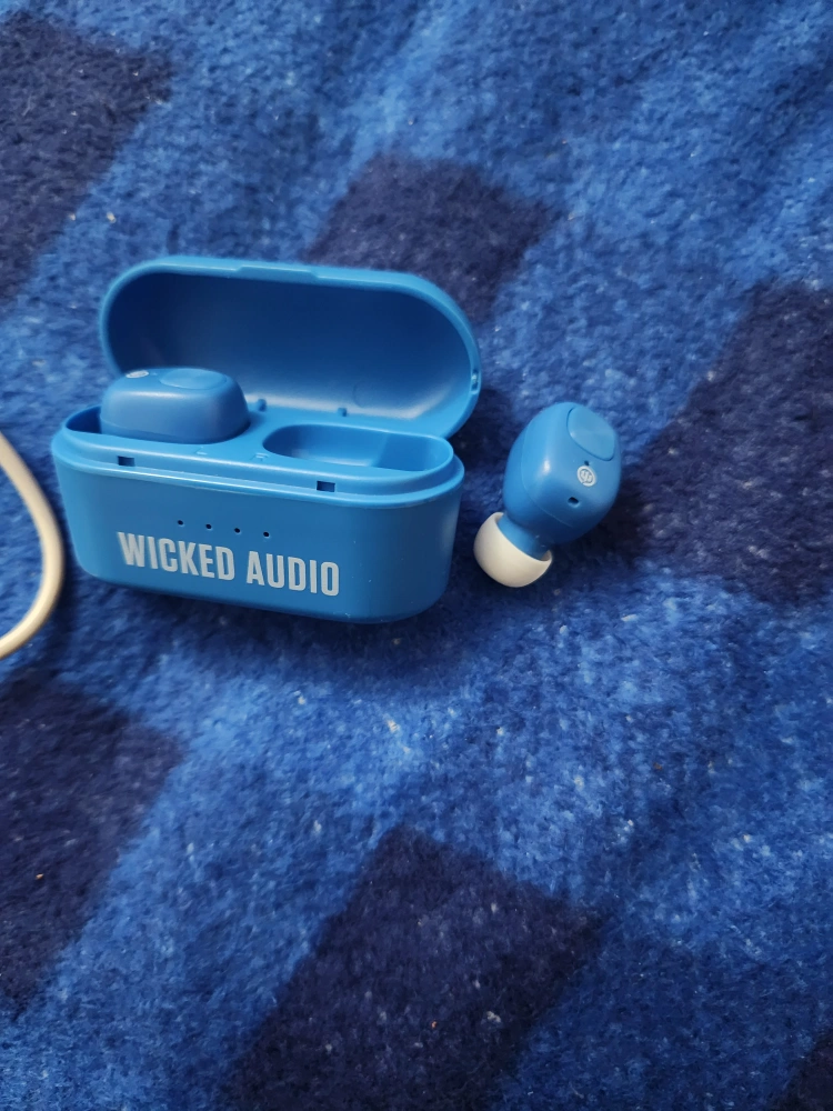 Blue wireless earbuds. Includes charging case and USB charging cable. Portable and convenient. Great for listening to music or podcasts. Bag have been used for 1month. Both are $20.00