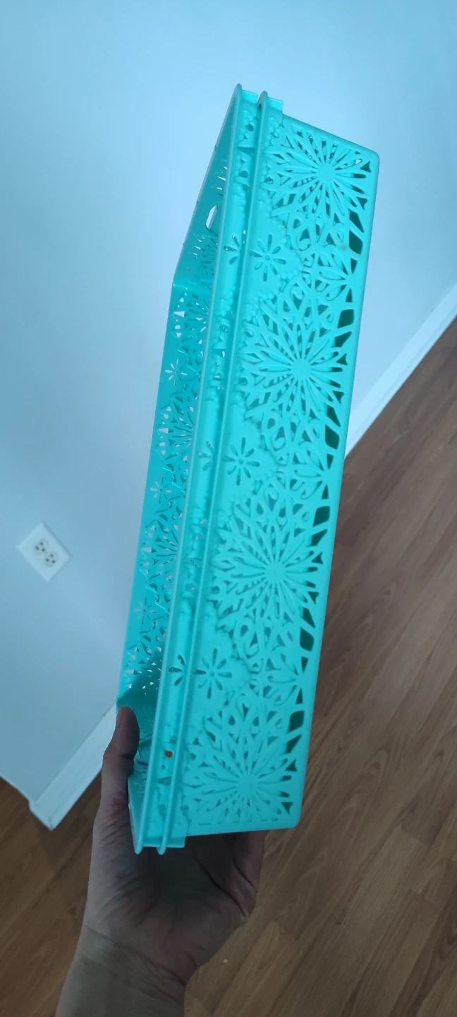 Two decorative storage baskets with cutout snowflake design. It has built-in handles for easy carrying. Plastic material.