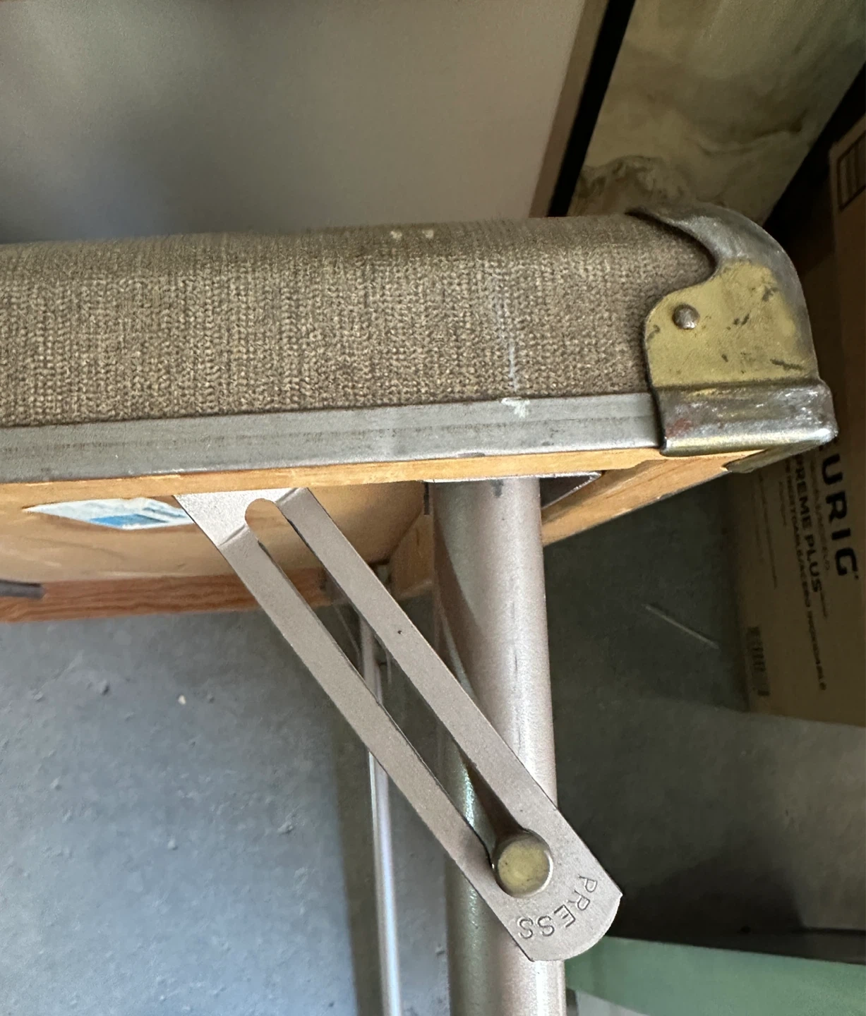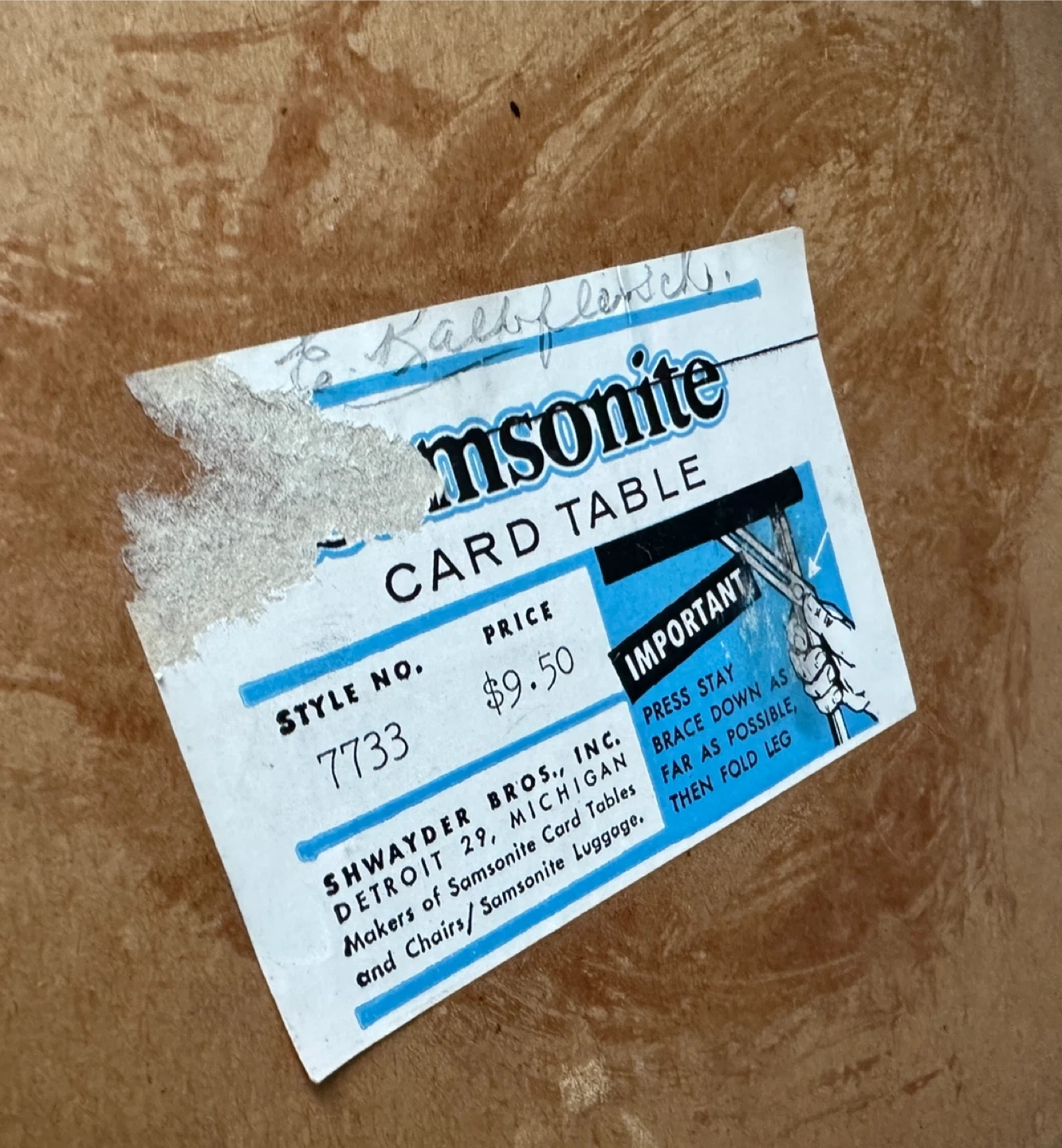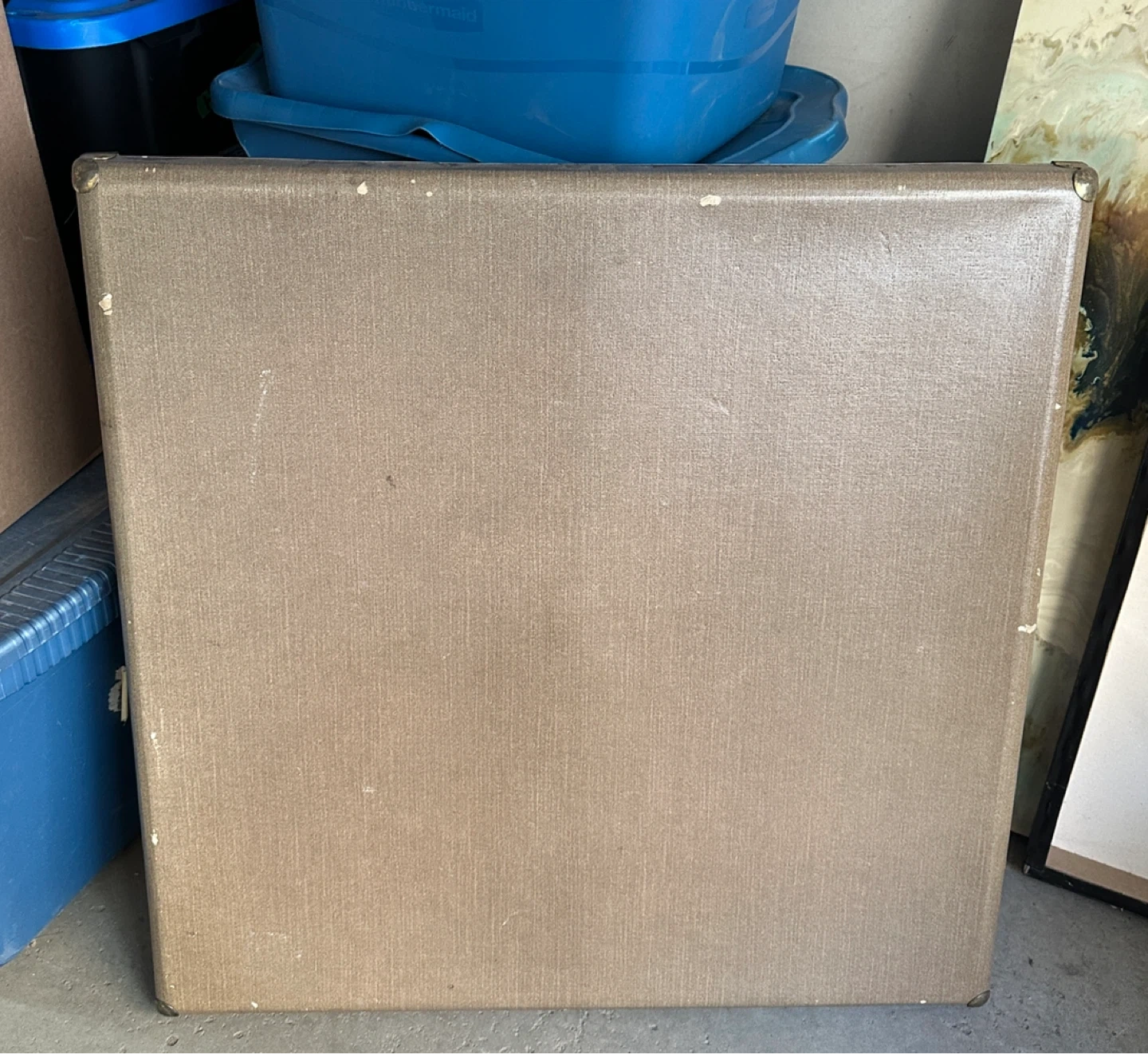 Canvas folding table with metal legs. Approximately 30 inches by 30 inches when open. It folds flat for storage.