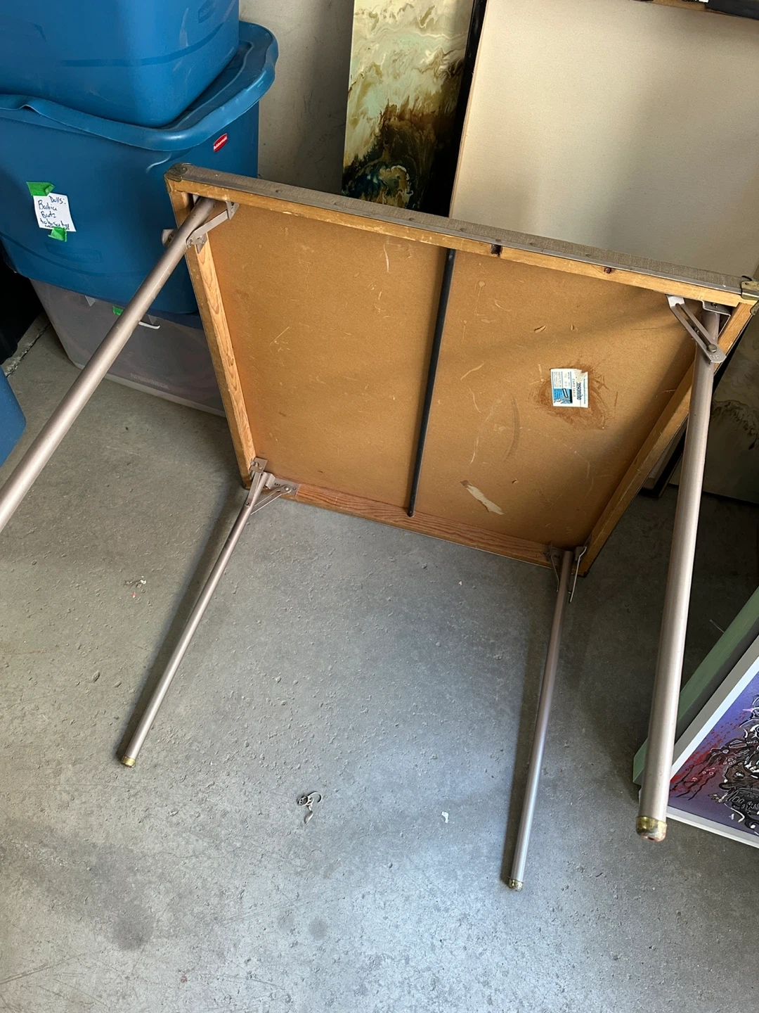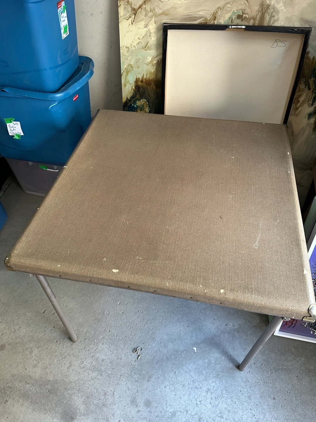 Canvas folding table with metal legs. Approximately 30 inches by 30 inches when open. It folds flat for storage.