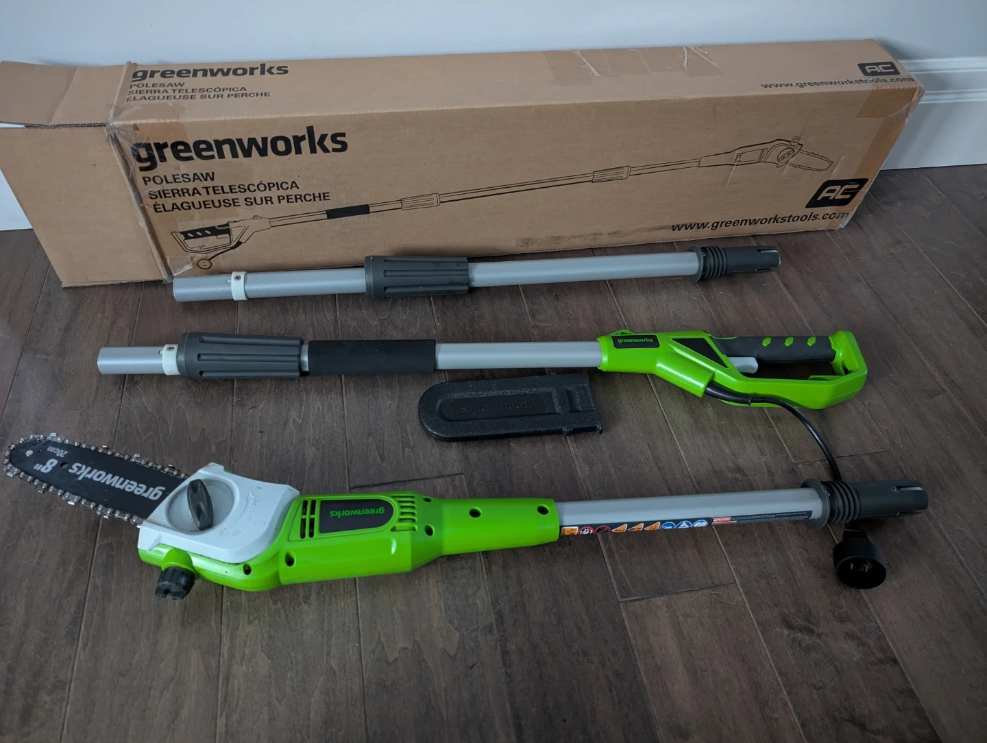 Like new Greenworks mini chainsaw pole saw for sale. Corded, auto oil, 8” inch blade, 6.5Amp powerful motor, up to 8’ feet aluminum shaft extension. $75 FIRM.