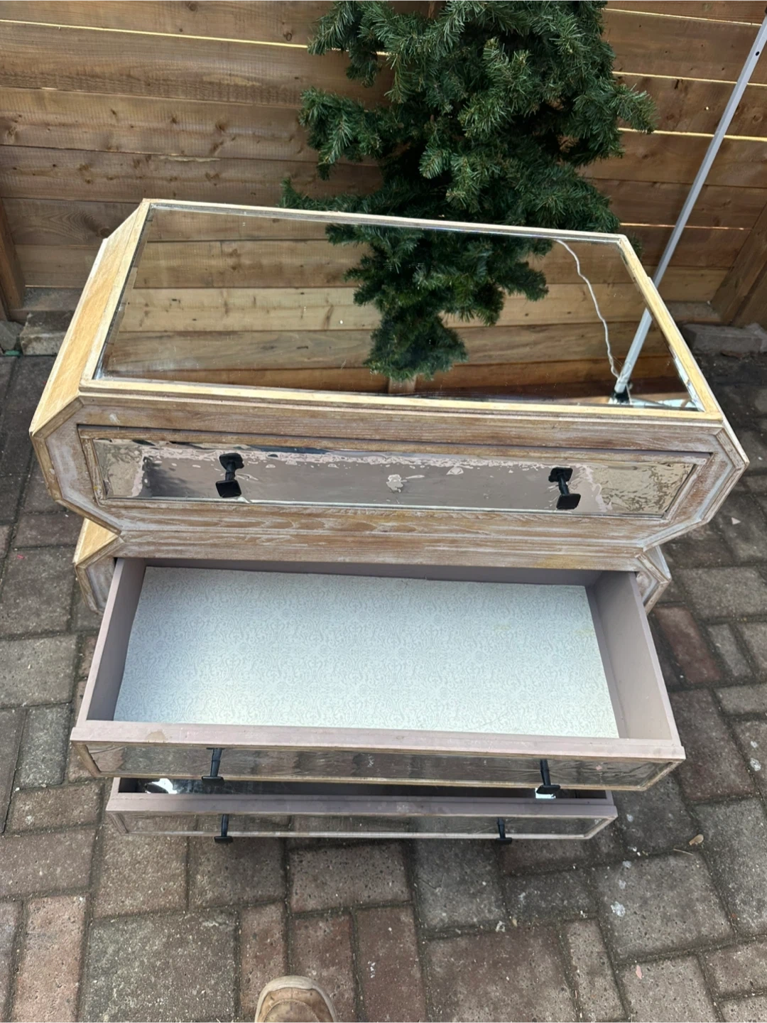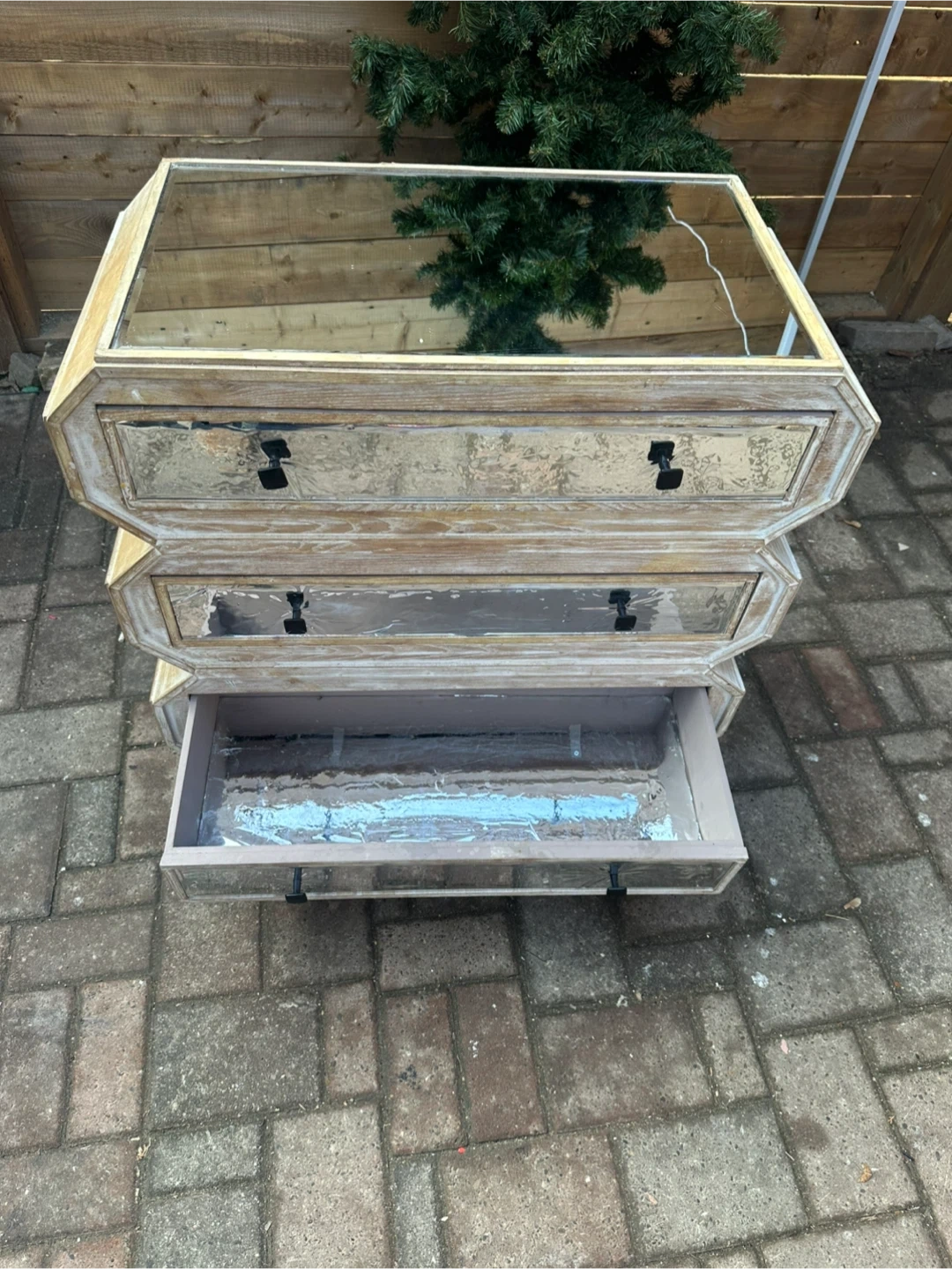 A vintage-style mirrored chest of 3 drawers with a rustic, distressed wood finish.