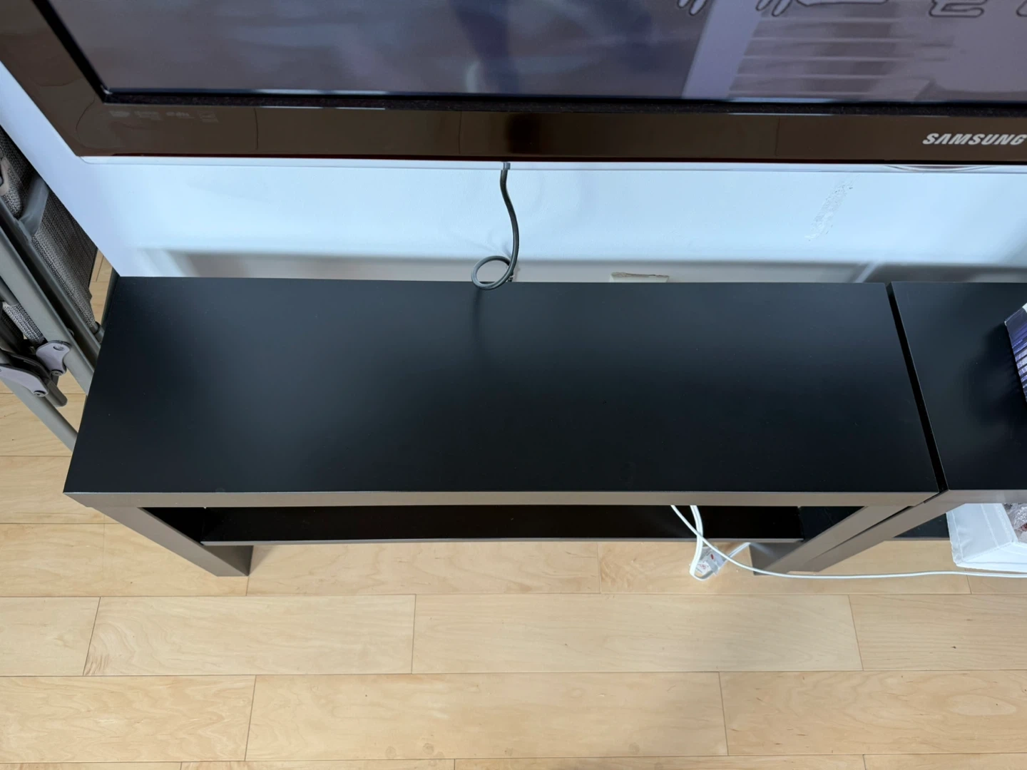 A simple black TV stand with a convenient lower shelf. Its sturdy construction supports your television and media components. This stand is perfect for organizing electronics in your living room.