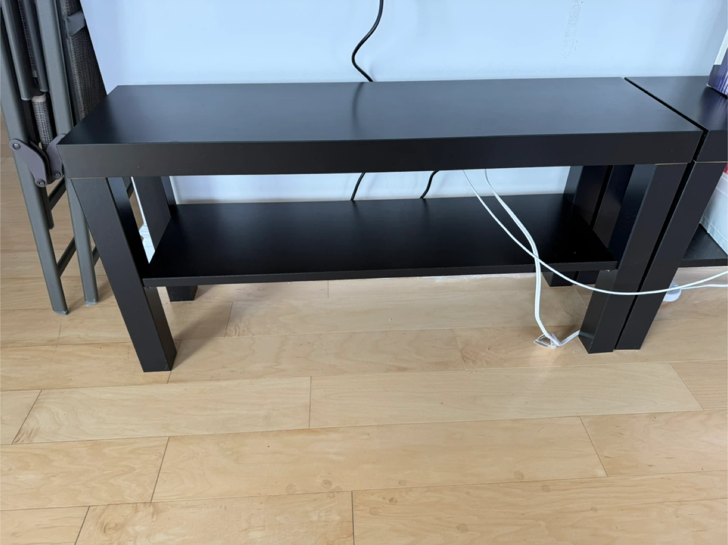 A simple black TV stand with a convenient lower shelf. Its sturdy construction supports your television and media components. This stand is perfect for organizing electronics in your living room.