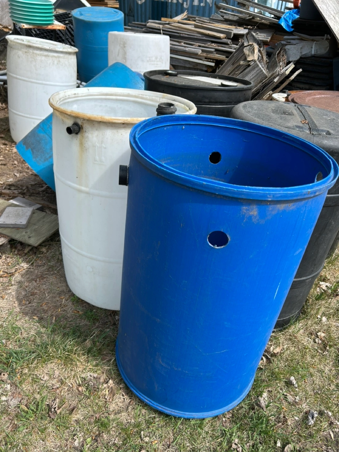 Assorted plastic rain barrels , some open, some with lids Clean , white and blue Cash please Can arrange delivery Located near Beaumont
