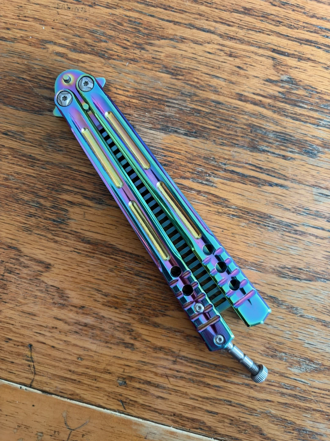 5Metal Rainbow Butterfly Comb, in Excellent condition with no scratches, dents and scuffs, smooth screws for smooth flips and tricks, great weight distribution all around.