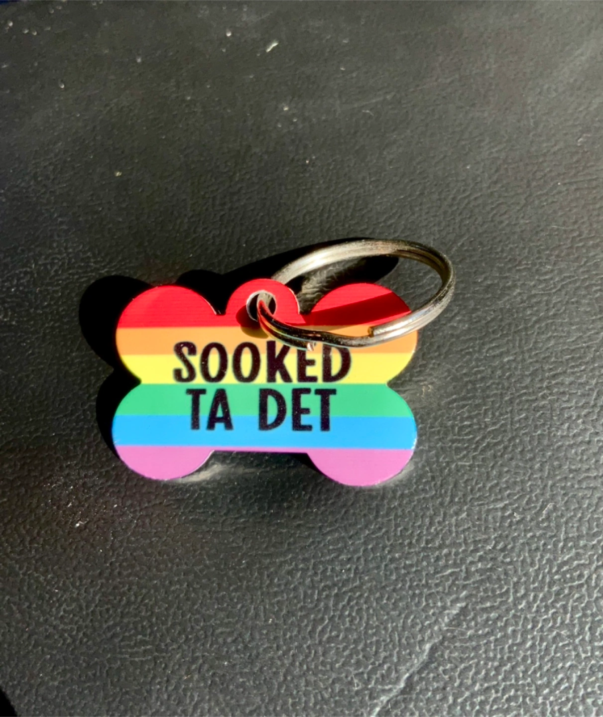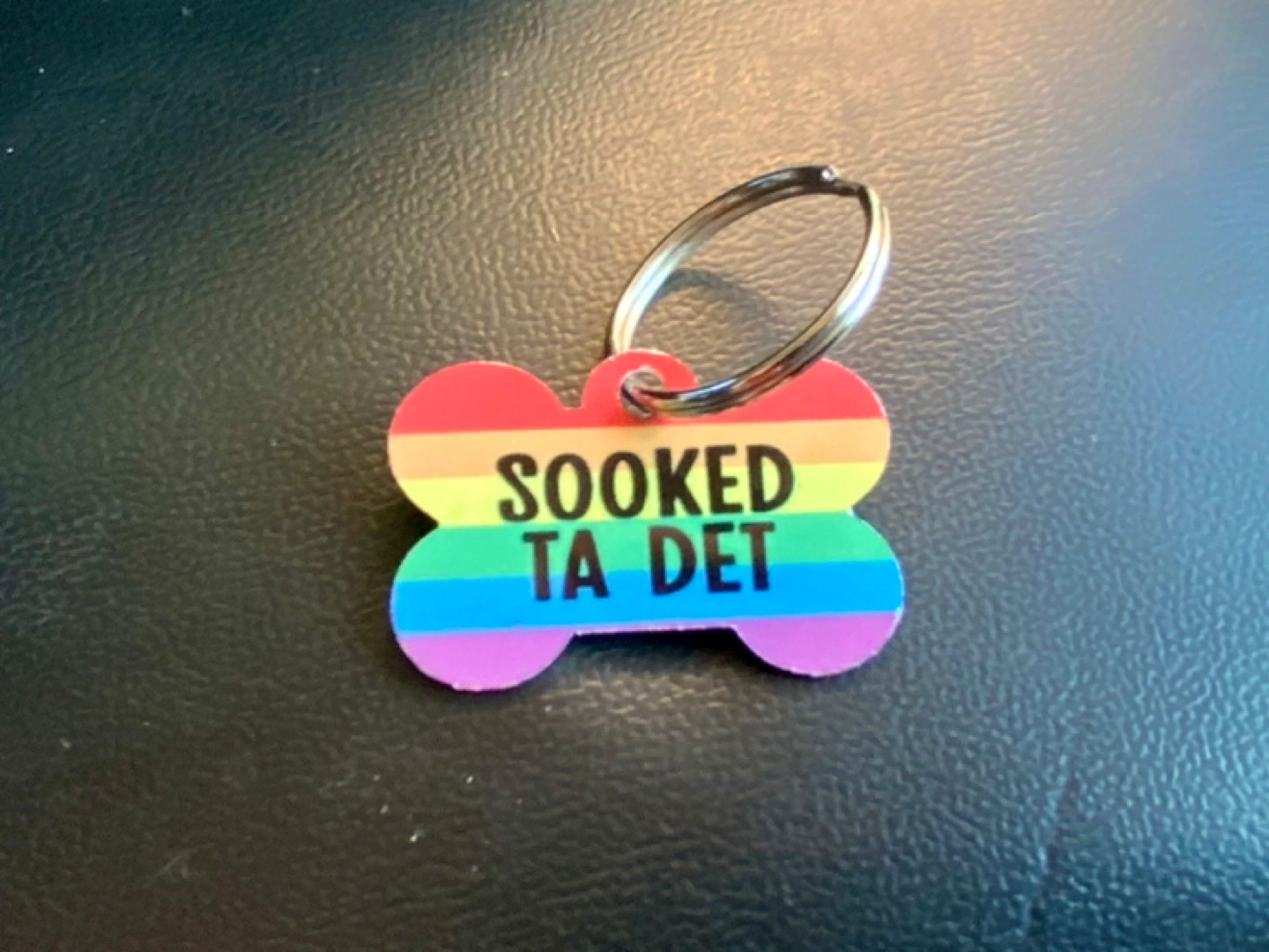 A colourful rainbow pride dog tag shaped like a bone. The tag has the Newfoundland saying 'SOOKED TA DET' printed on it. Same design on both sides.