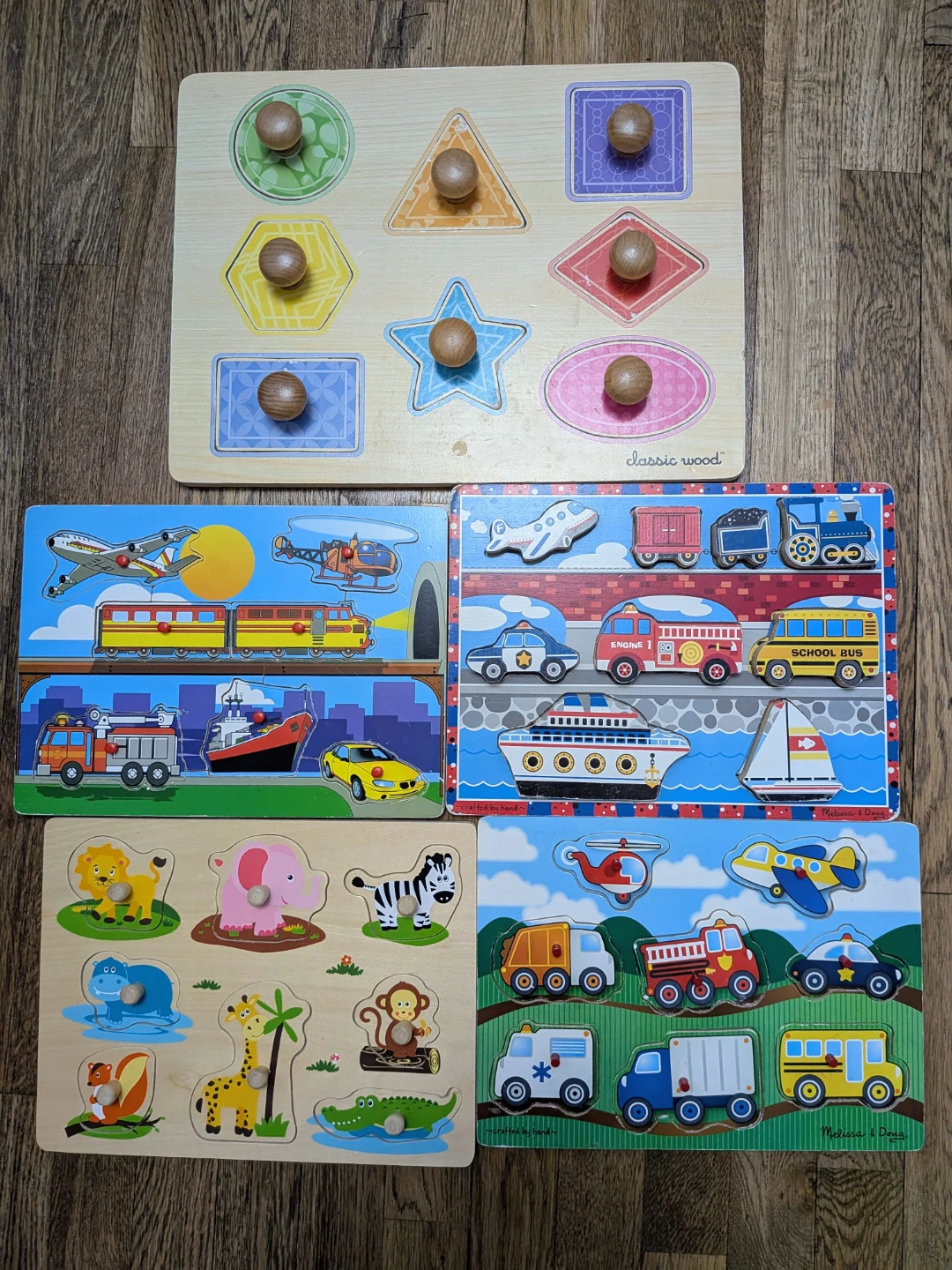 Set of five wooden peg puzzles featuring shapes, vehicles, and animals. Includes a Classic Wood shapes puzzle and three Melissa & Doug puzzles. Pieces have easy-to-grip wooden knobs. Great for little hands to learn sorting and identification!