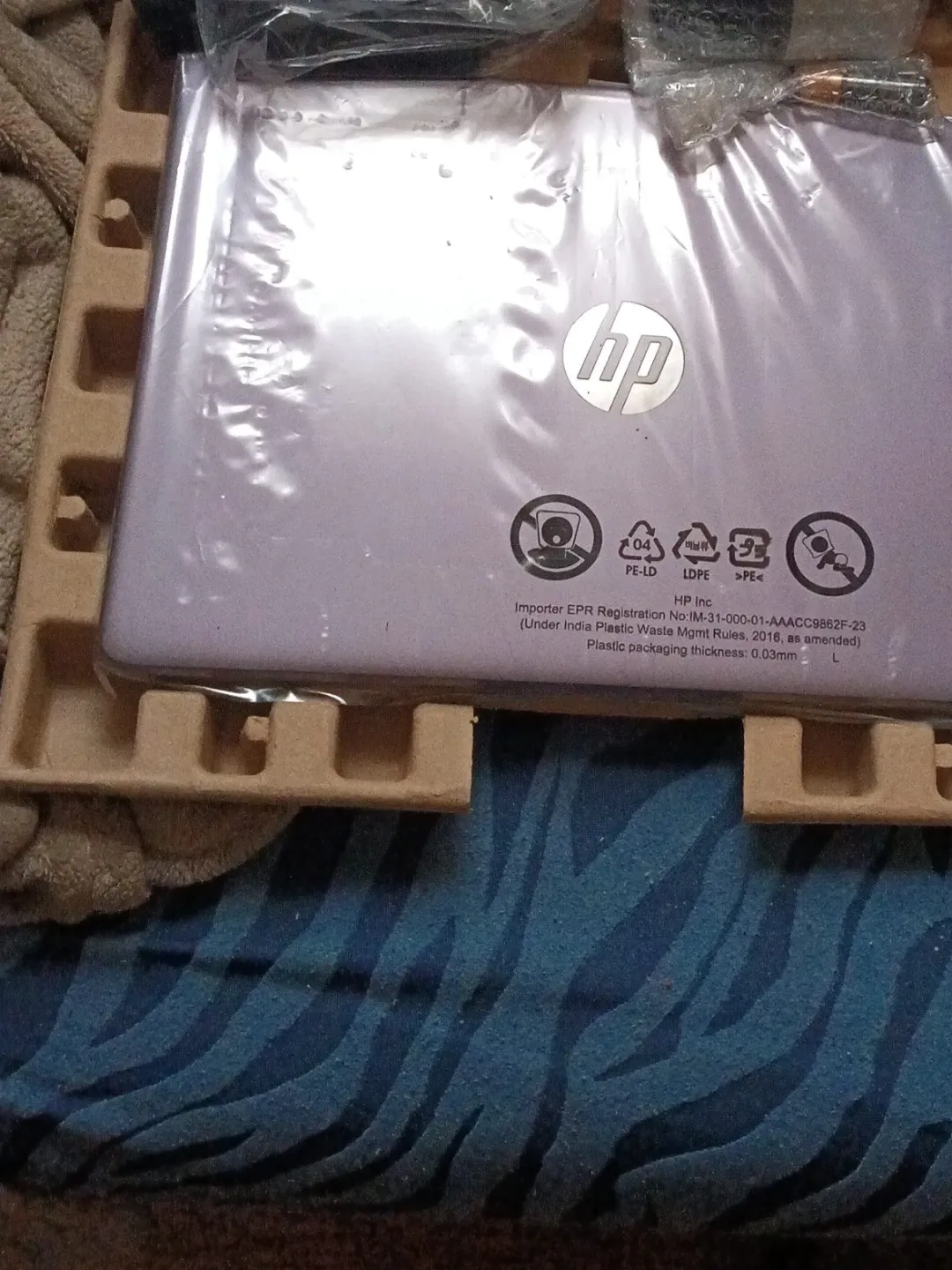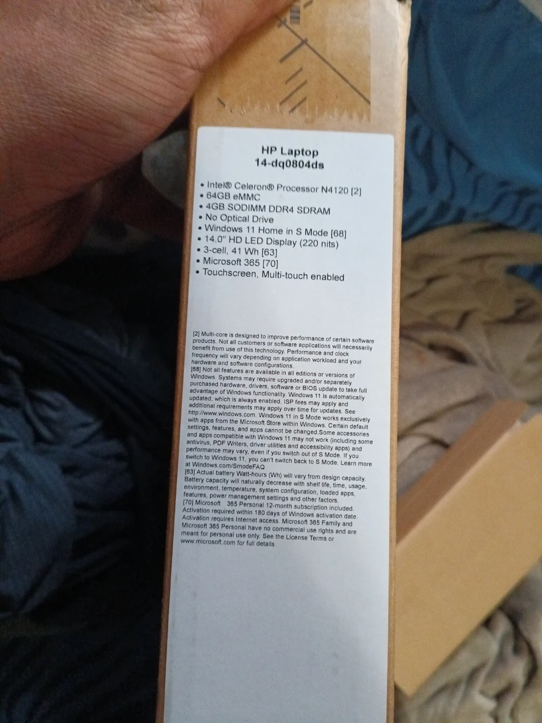 HP Laptop 14-dq0804ds with Intel Celeron Processor N4120. It's equipped with 4GB SDRAM, a 64GB eMMC, and a 14" HD LED display. Includes Microsoft 365 and touchscreen functionality. The original box, power adapter, and protective sleeve are included.