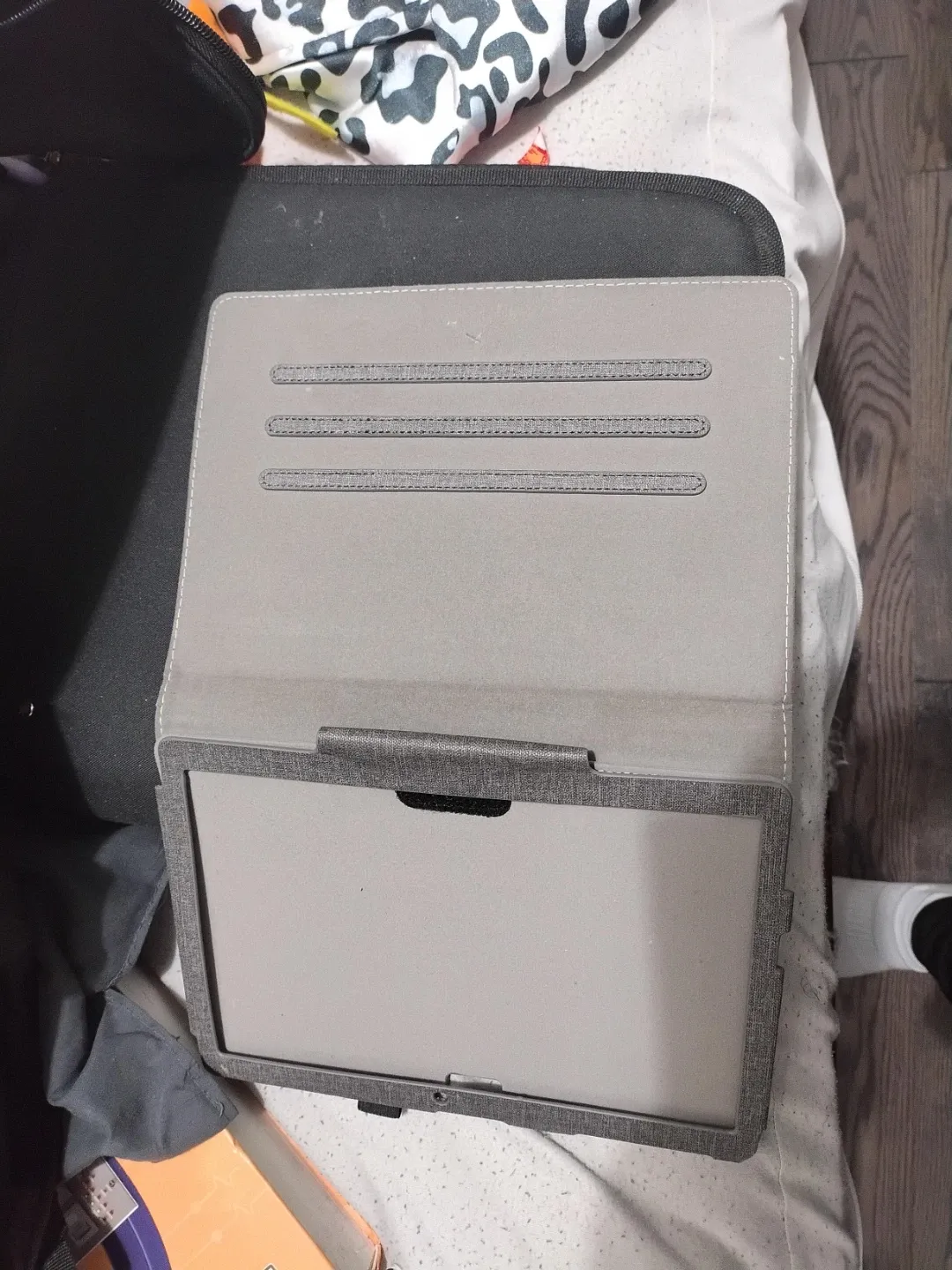 This is a grey tablet case with a built-in stand. It has a textured exterior and a soft interior lining. It's suitable for holding your tablet securely.