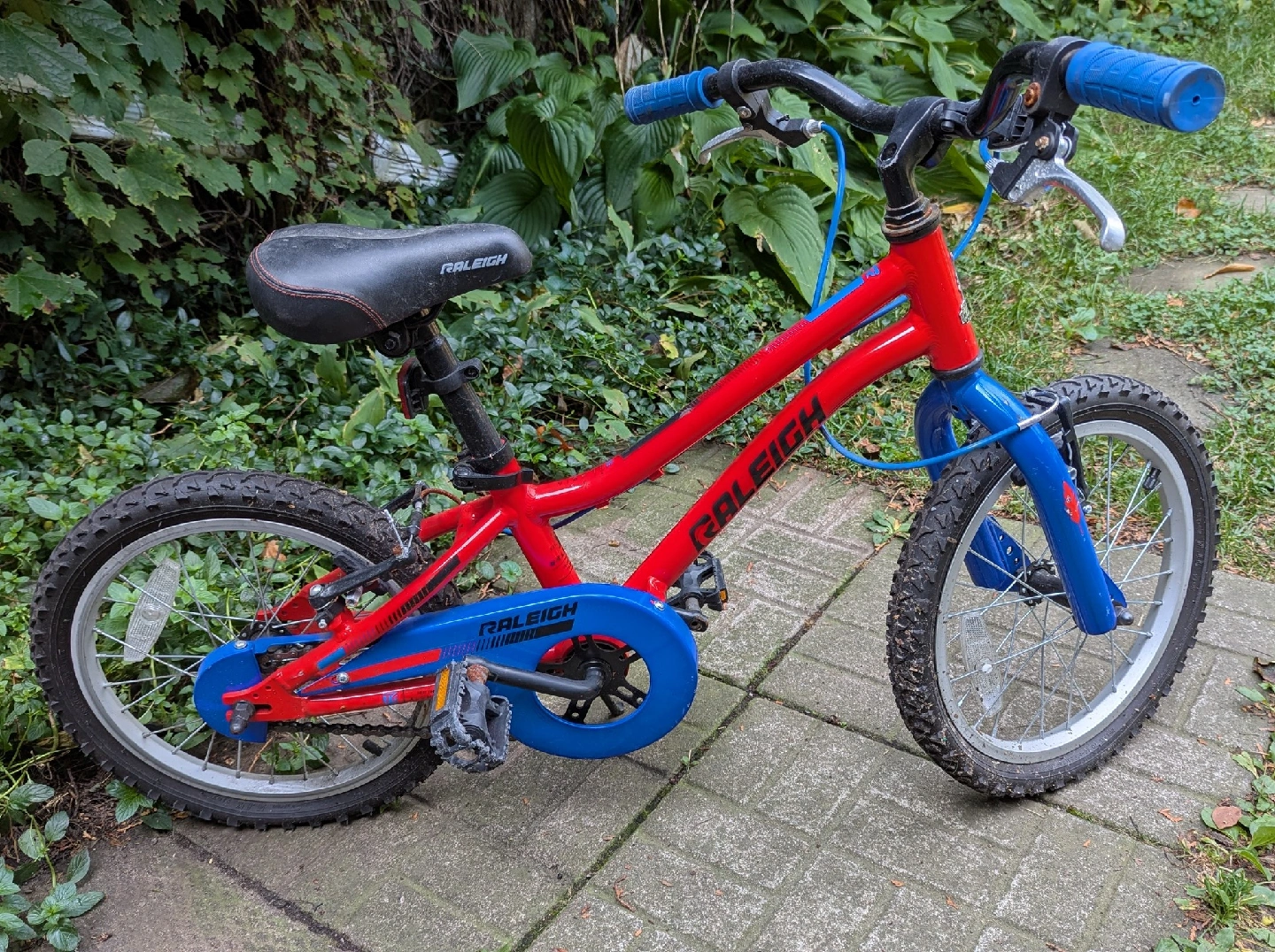 Selling a Raleigh 16-inch kids bike in red and blue. It's in good condition and ready for a new rider! Perfect for kids learning to ride.