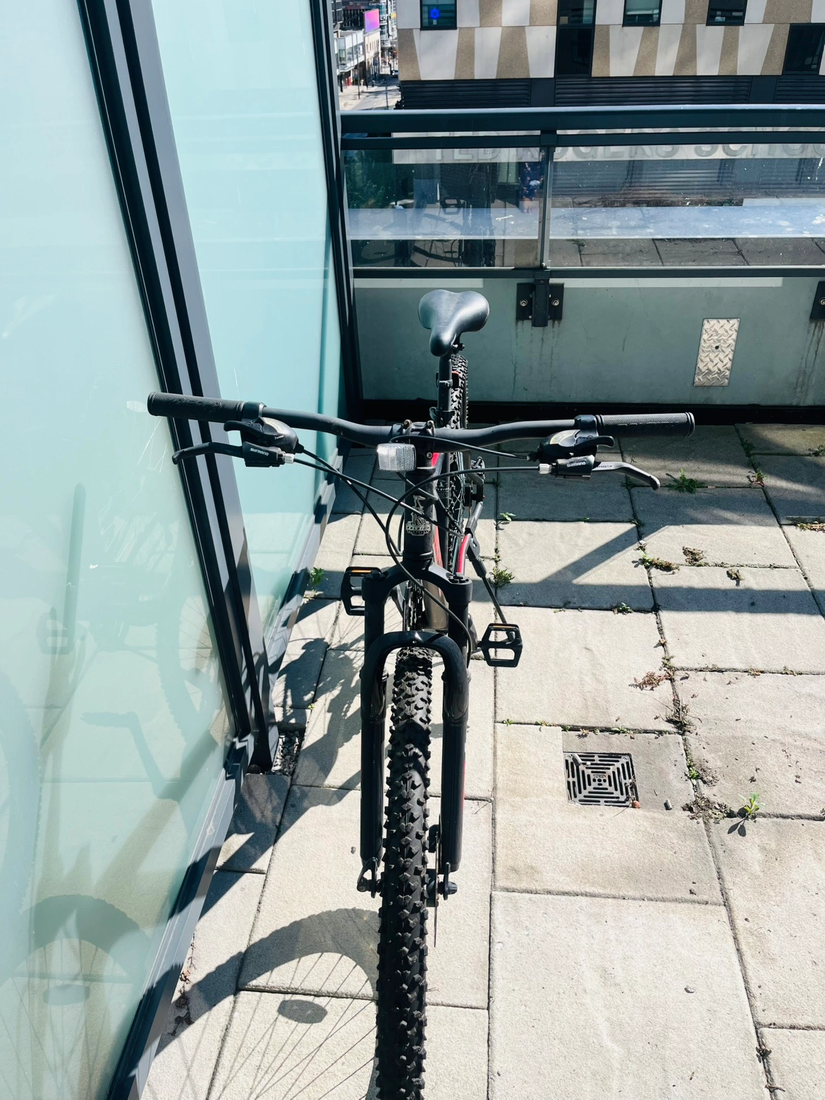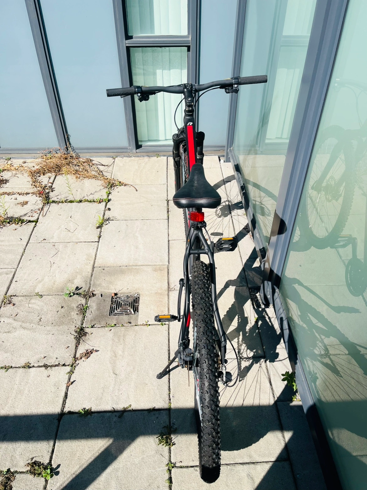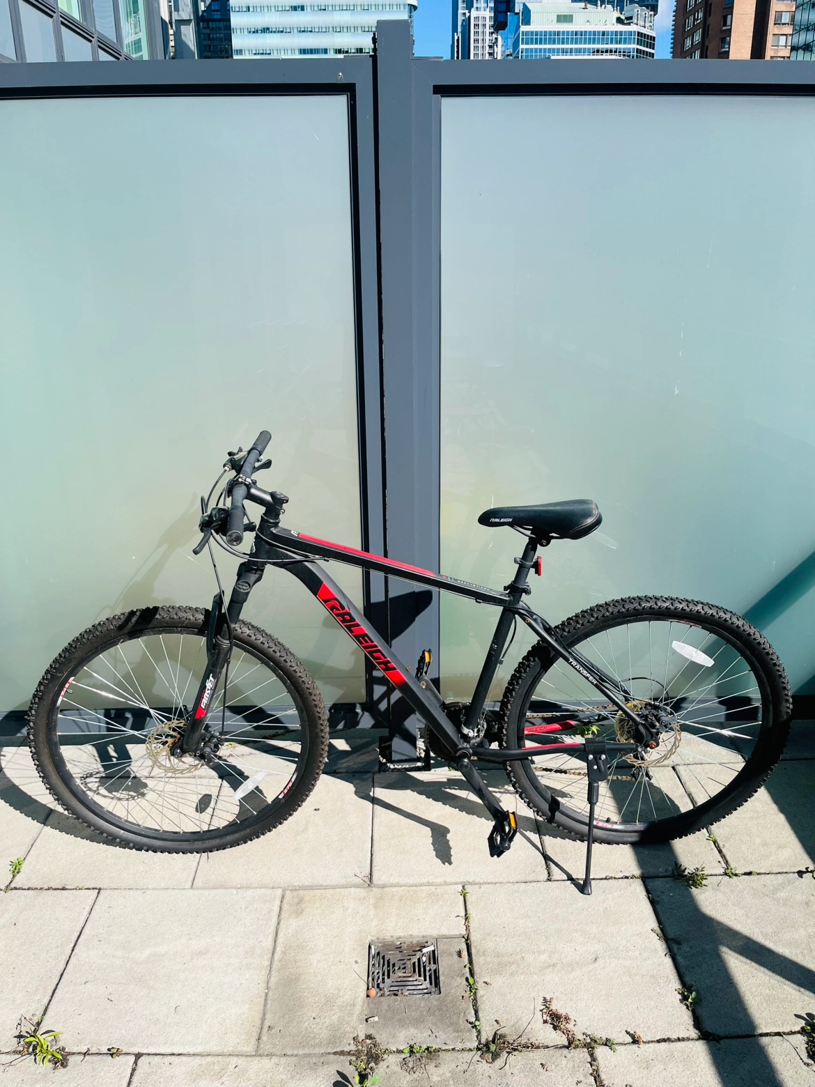 76Black and red mountain bike with disc brakes and a kickstand. With bills and only used for 2 months. Purchase date is 2021 but was in indoor garage for almost all its life except the first 2 months.