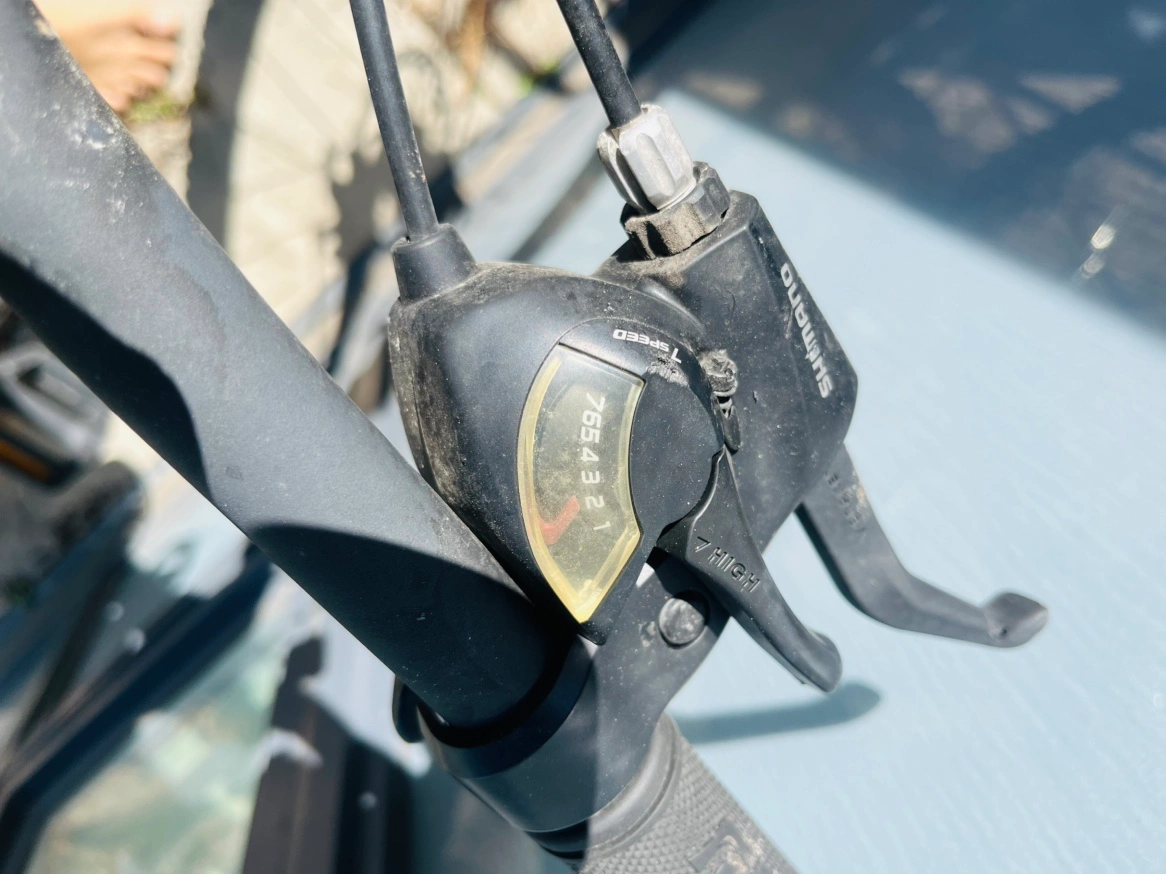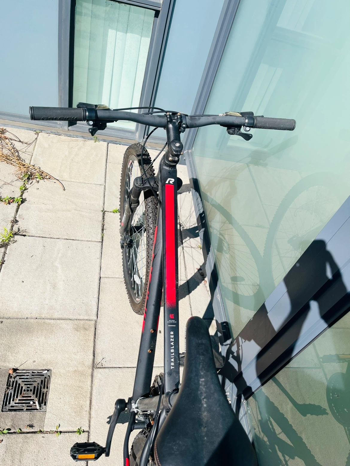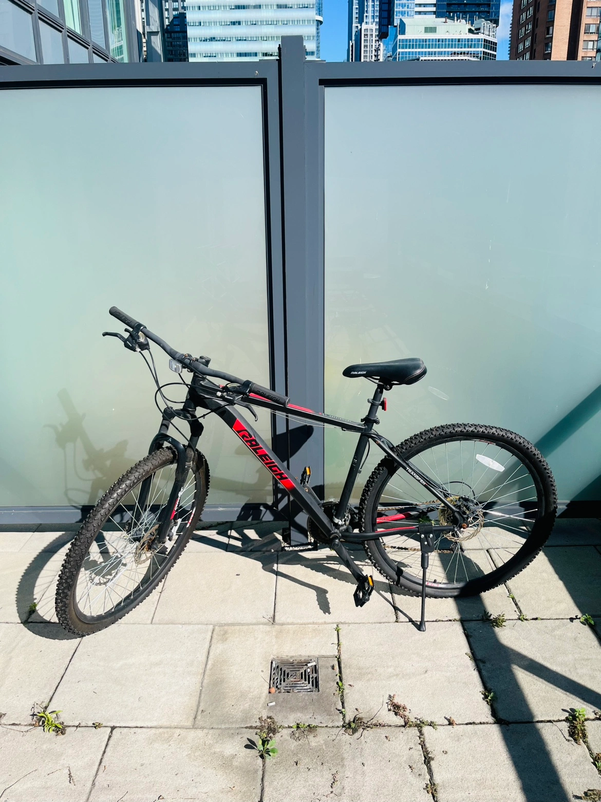 76Black and red mountain bike with disc brakes and a kickstand. With bills and only used for 2 months. Purchase date is 2021 but was in indoor garage for almost all its life except the first 2 months.