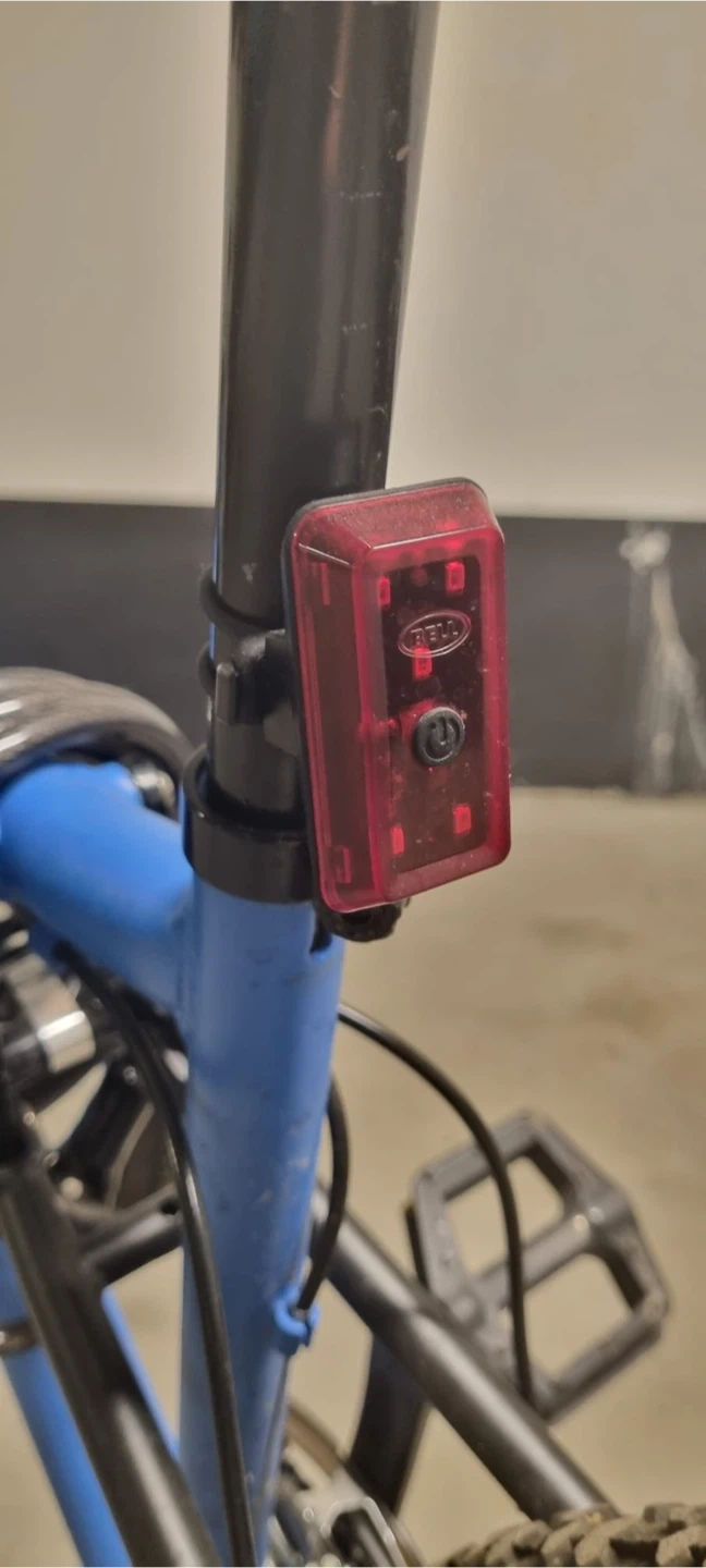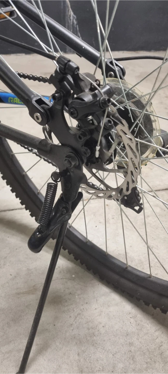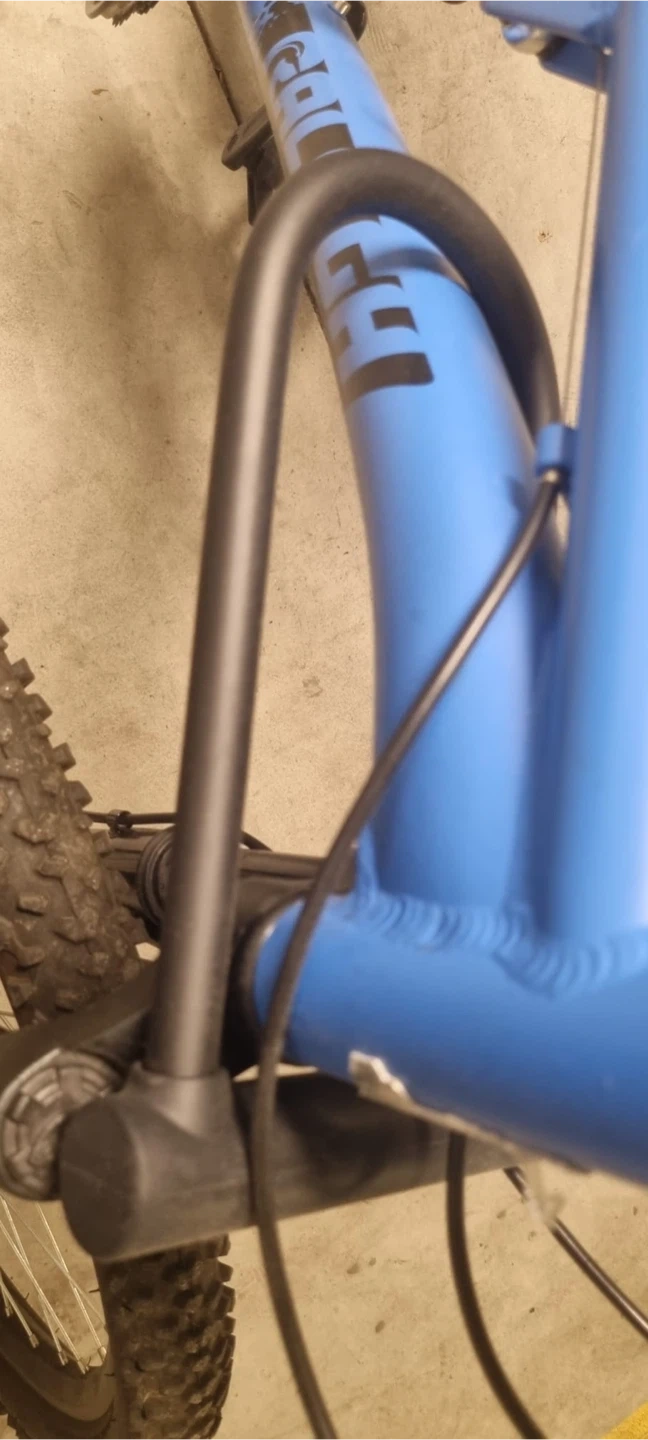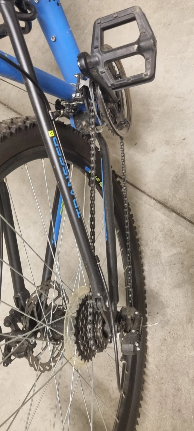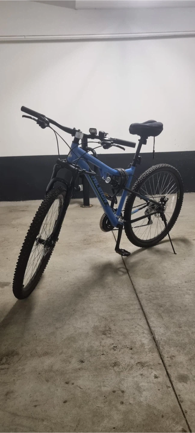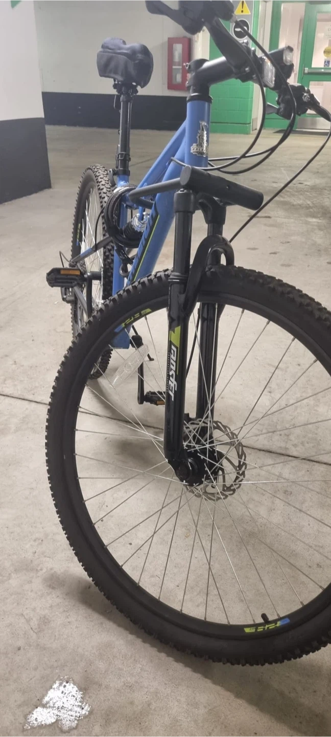 Selling a blue Raleigh Transier mountain bike. It features front suspension and a rear reflector for added safety. Great for trails or getting around town! Front tire is flat - break wire out of place Comes with accessories: Front and rear light - Helmet - Seat cover