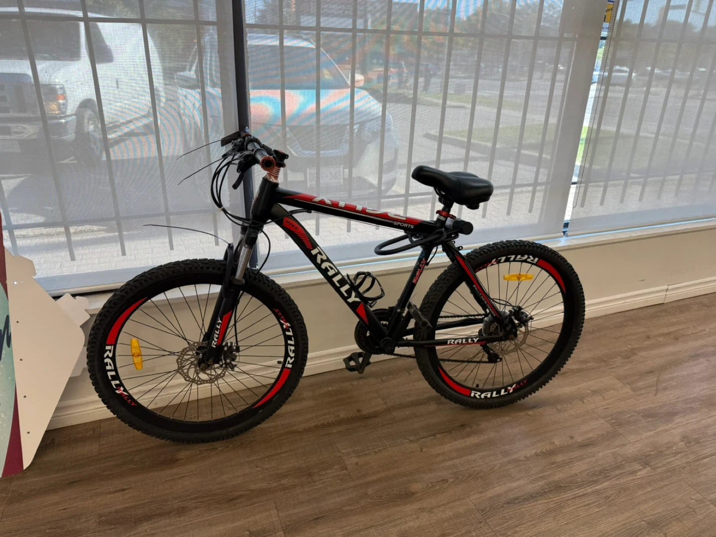 Selling a Rally Sports mountain bike in black and red! It's in good condition and ready for some adventures on the trails or around town