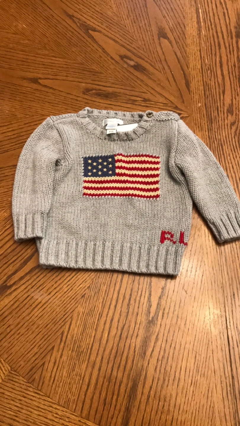 96Cozy Ralph Lauren baby sweater in size 9M. It features a cute American flag design and the RL logo on the front. Perfect for keeping your little one warm and stylish!