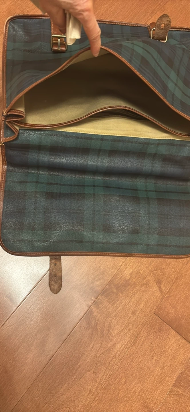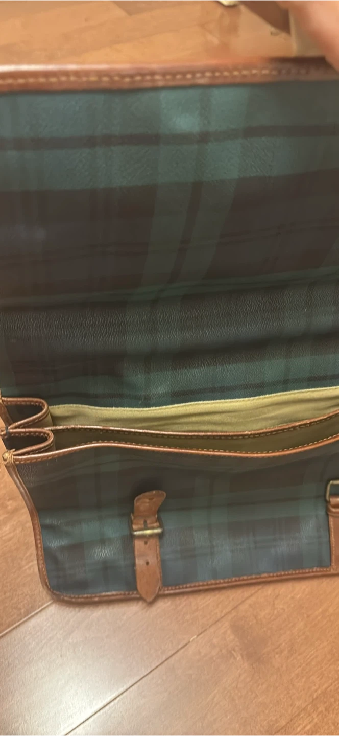 Classic Ralph Lauren briefcase featuring a stylish plaid pattern with leather trim. This bag is perfect for adding a touch of sophistication to your professional look. It has a spacious interior to keep your essentials organized.