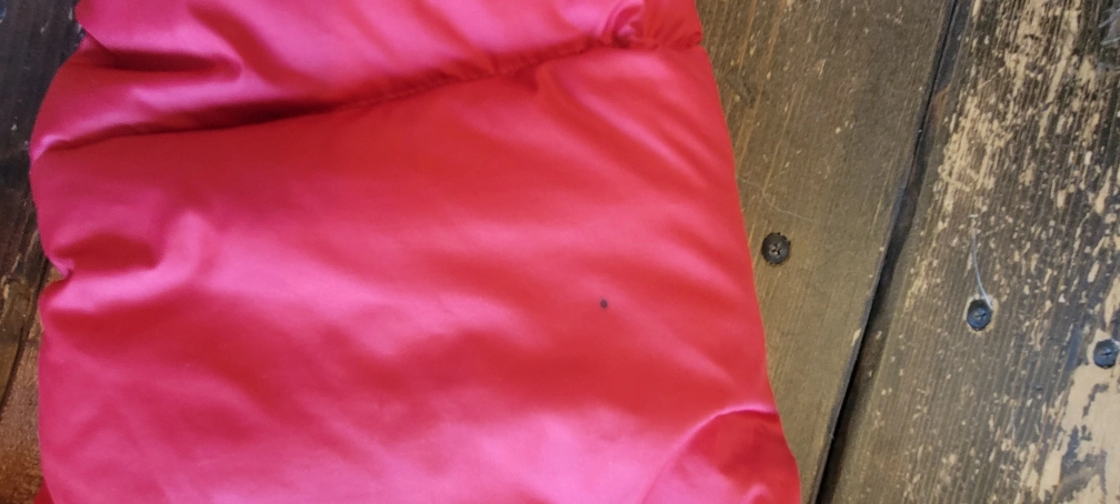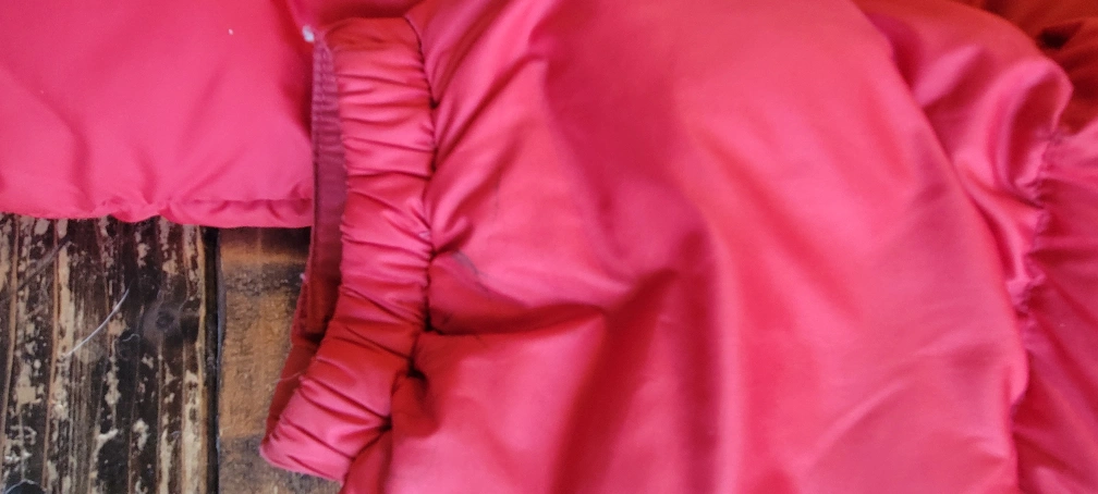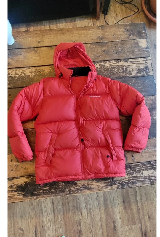 A red puffer jacket with a hood. It has a zipper closure and a button closure. It has two pockets on the front. The jacket is in good condition and has been washed. It is a size medium. There are a few tiny marks that are reflected in the price.