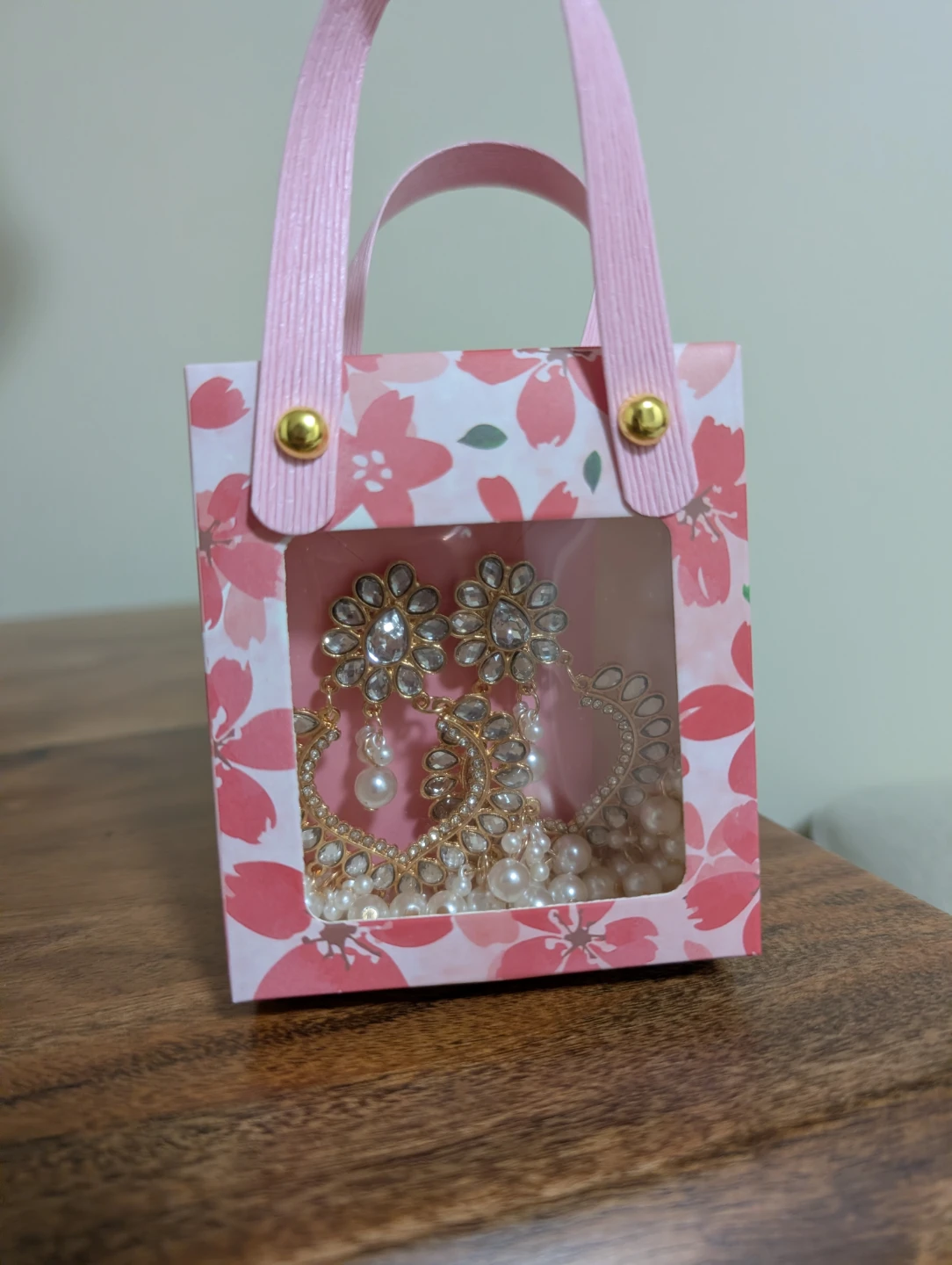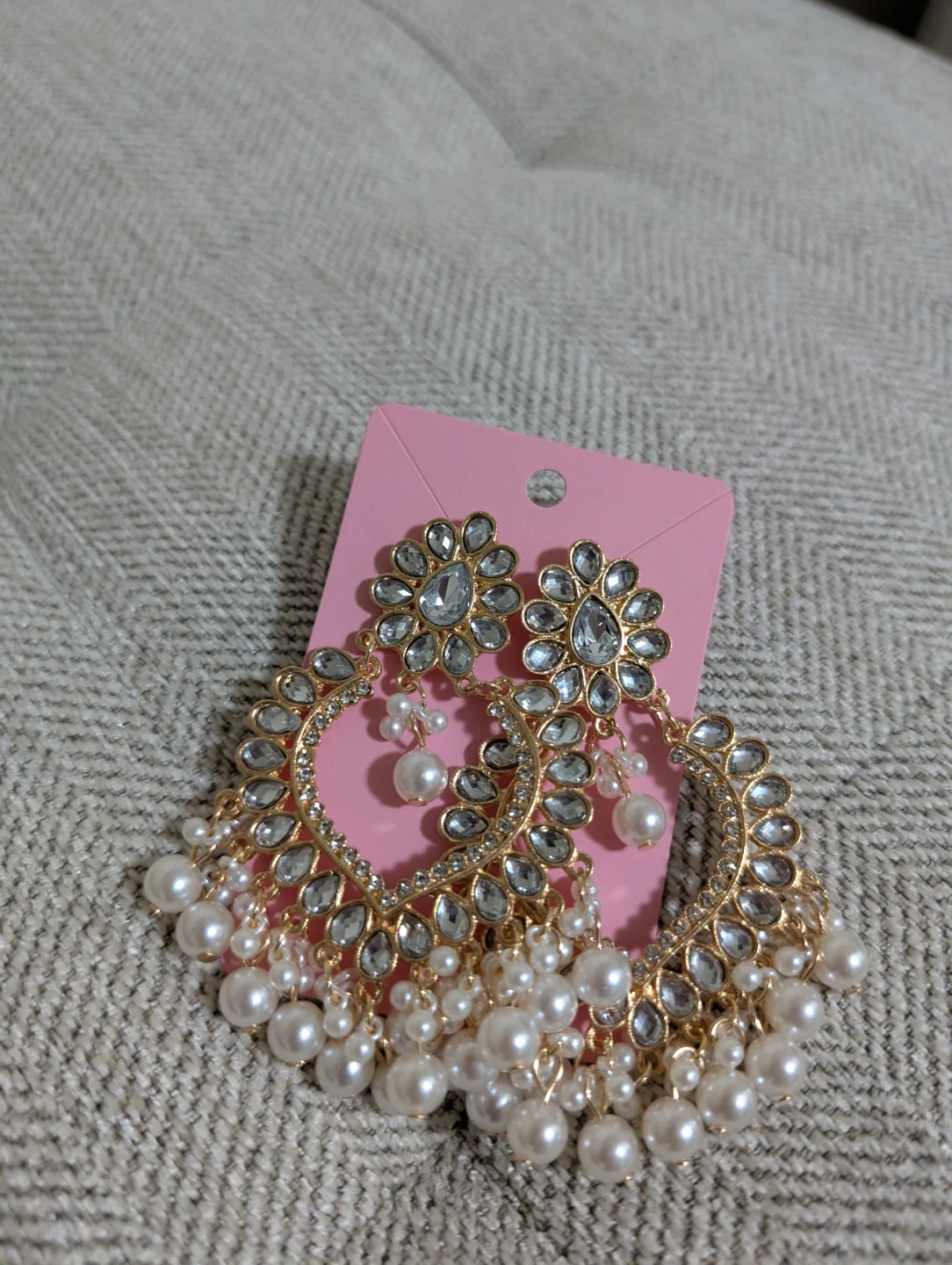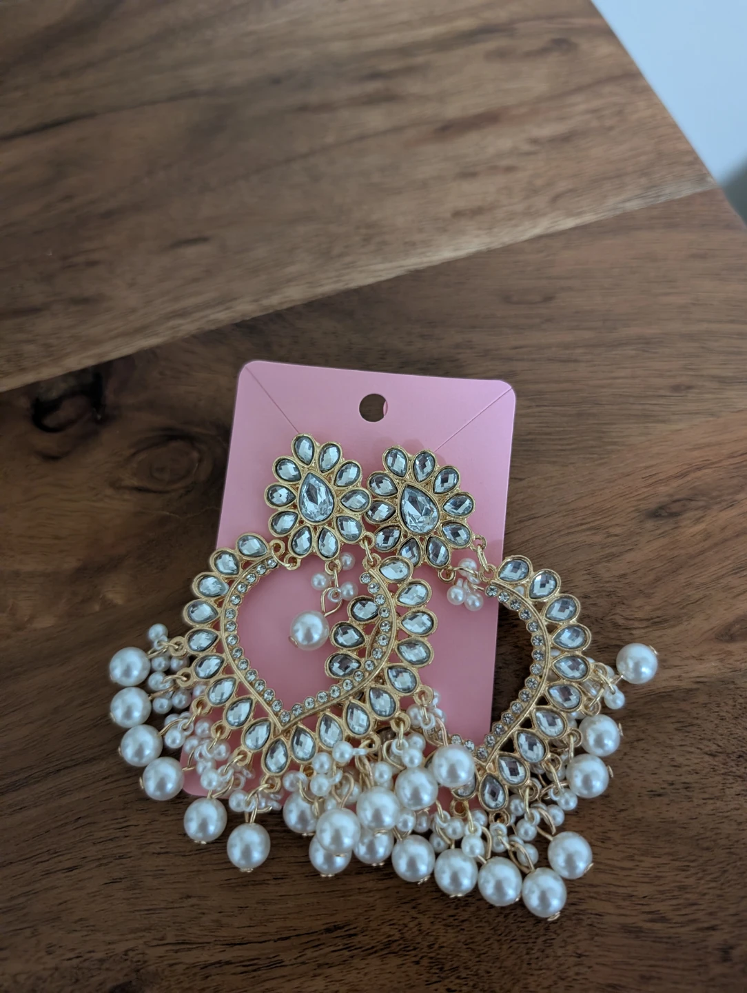 These elegant gold-tone dangle earrings feature a heart-shaped design embellished with clear rhinestones and dangling faux pearls. They're perfect for adding a touch of sparkle to your outfit. The earrings come in a decorative floral gift box.