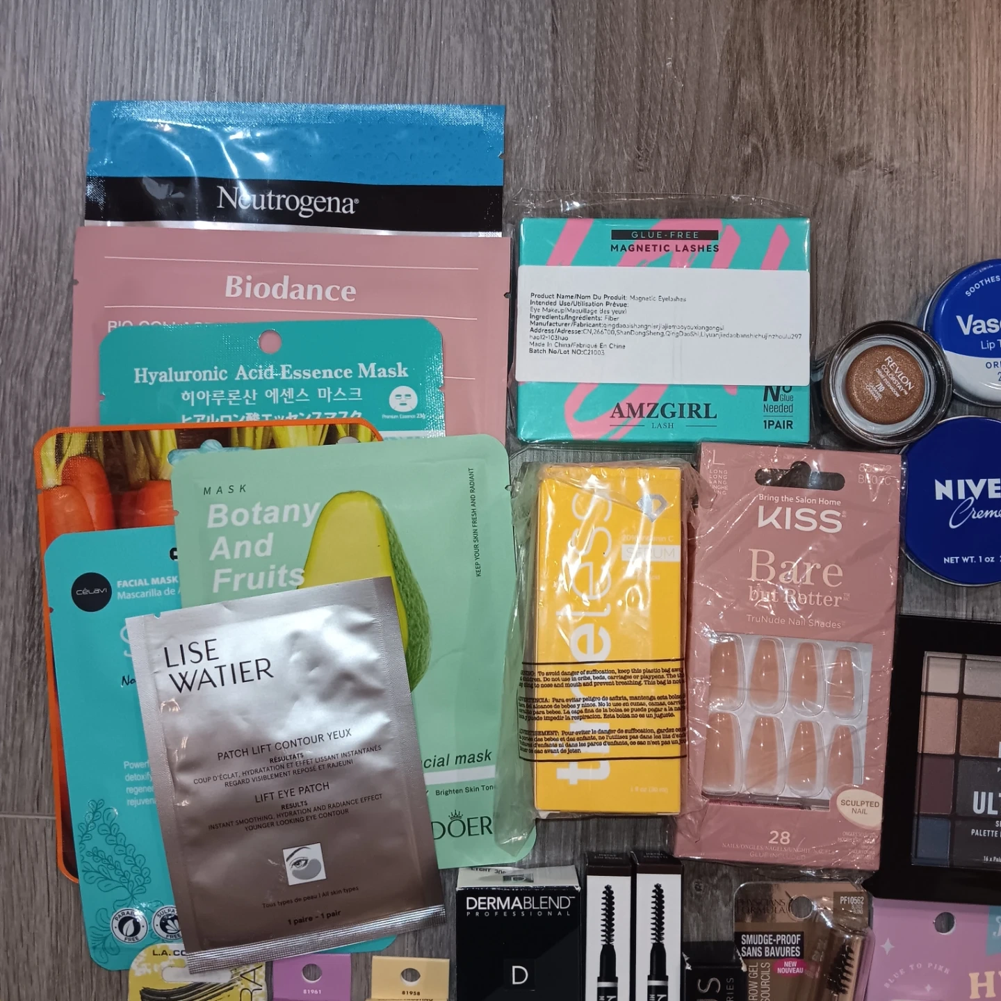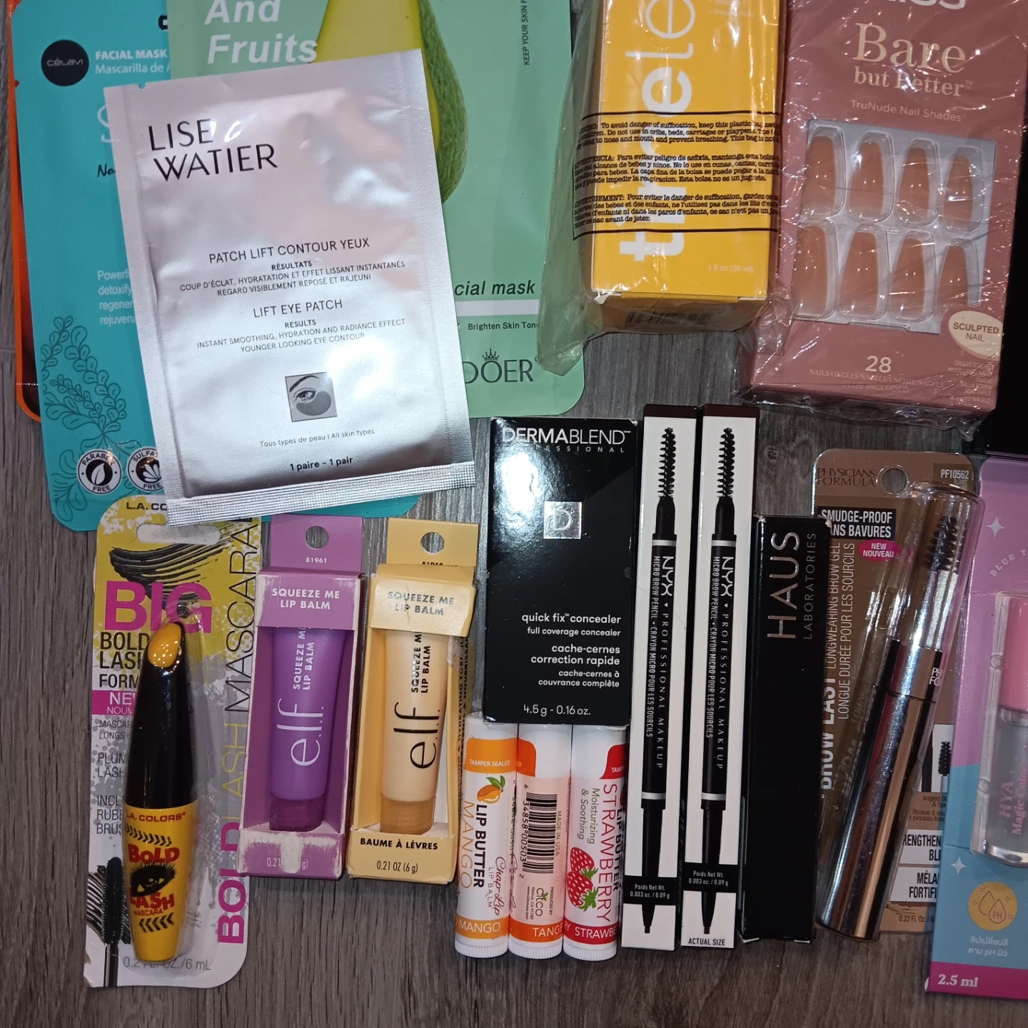 This lot includes a variety of makeup and skincare items. You'll find items like the NYX Ultimate Shadow Palette, Elf lip balms, Kiss press-on nails, and a Lise Watier eye patch. Many popular brands are included for your beauty needs.