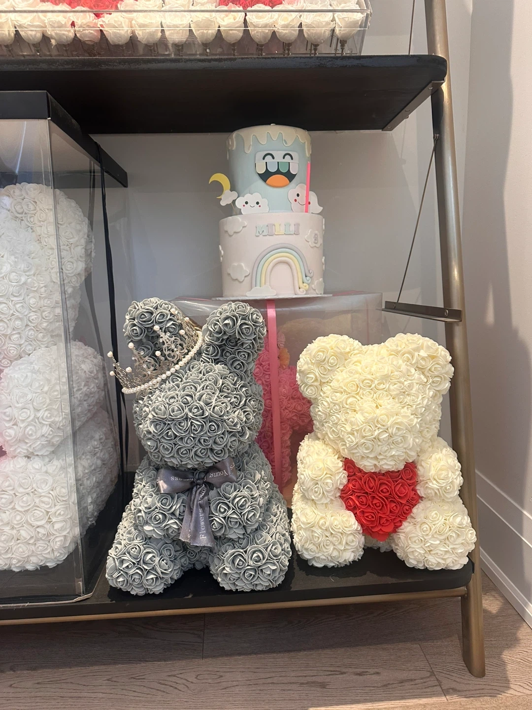 This is a grey teddy bear made of artificial roses. It's adorned with a sparkly crown and a ribbon. It's a unique decorative piece.