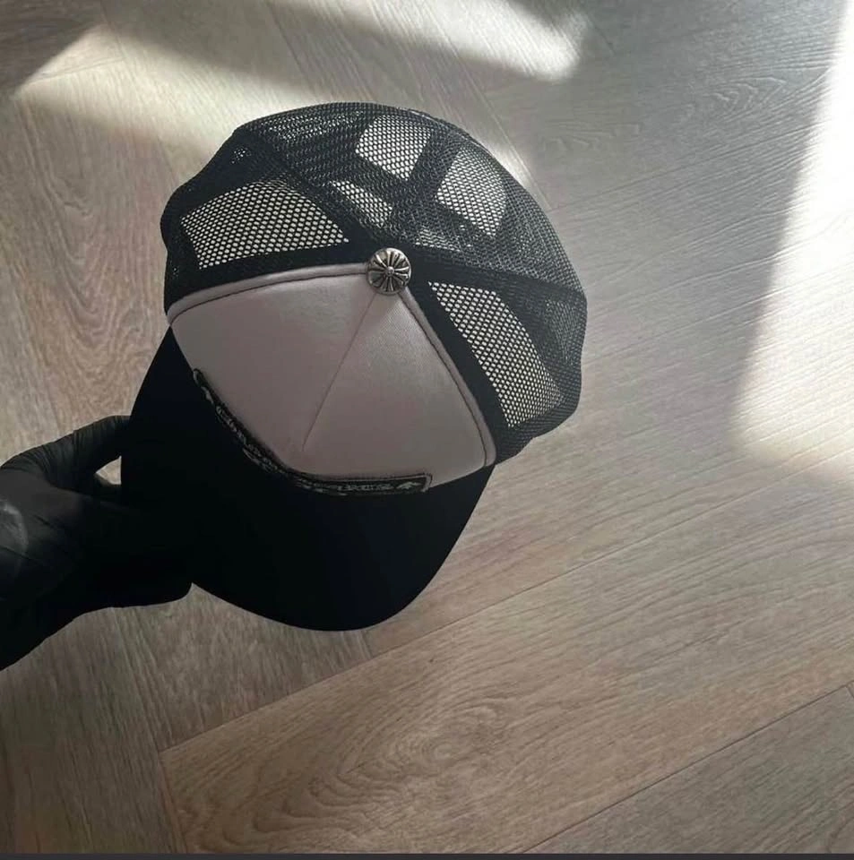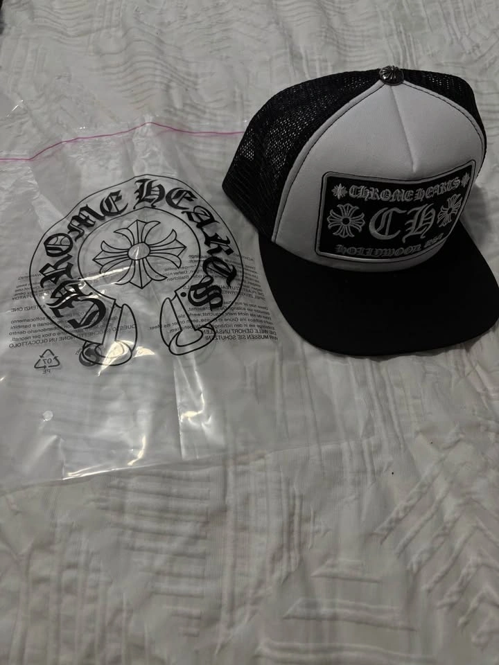 Chrome Hearts Hollywood USA Trucker Hat in Black/White. Brand new, deadstock condition. Features a high-contrast white foam front, black mesh, and signature gothic embroidery. Comes with a branded Chrome Hearts dust bag. This is the classic OG colorway, perfect for any outfit.
