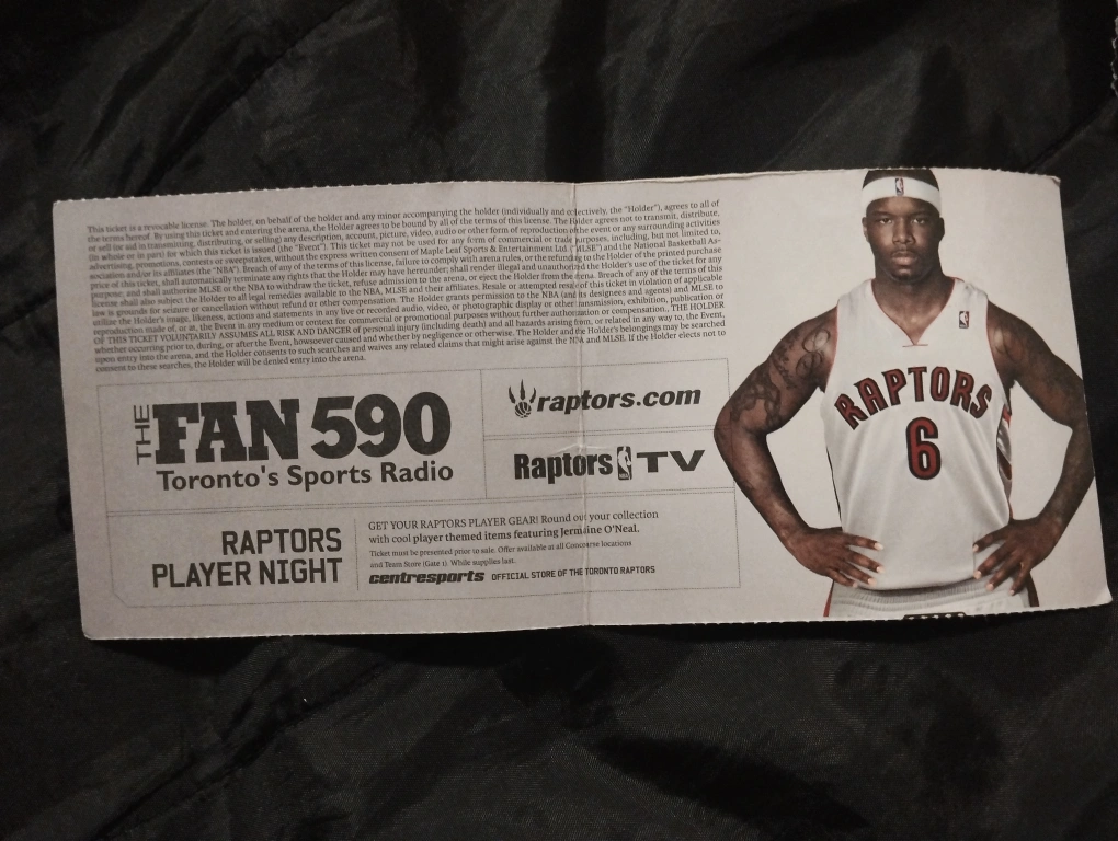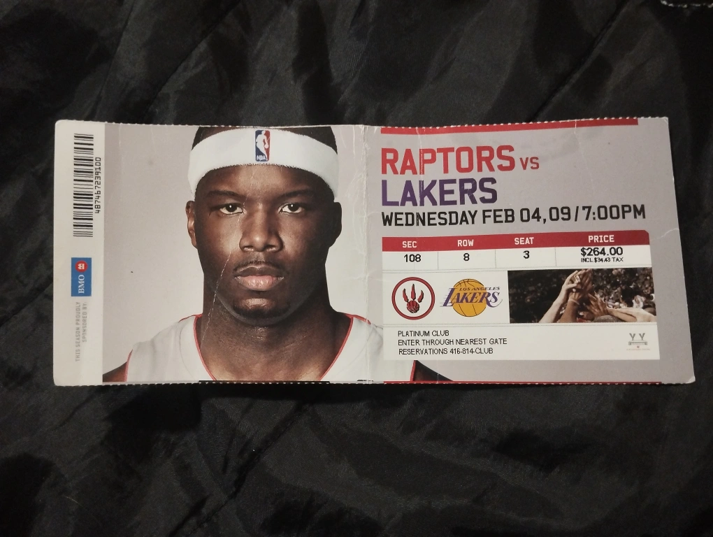 10I'm selling a ticket for the Raptors vs Lakers game. Date: Wednesday, February 04, 09 / 7:00PM Section: 108 Row: 8 Seat: 3 Price: $264.00 Incl $34.40 Tax