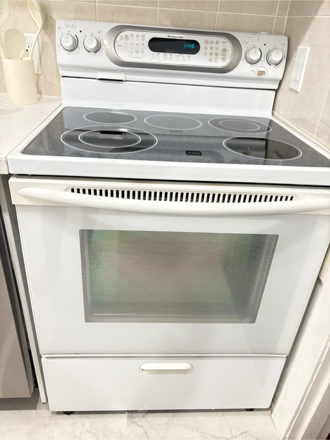 This is a white KitchenAid electric stove with a glass top and an oven. It features a digital display and four burners. The oven also includes a warming drawer at the bottom.