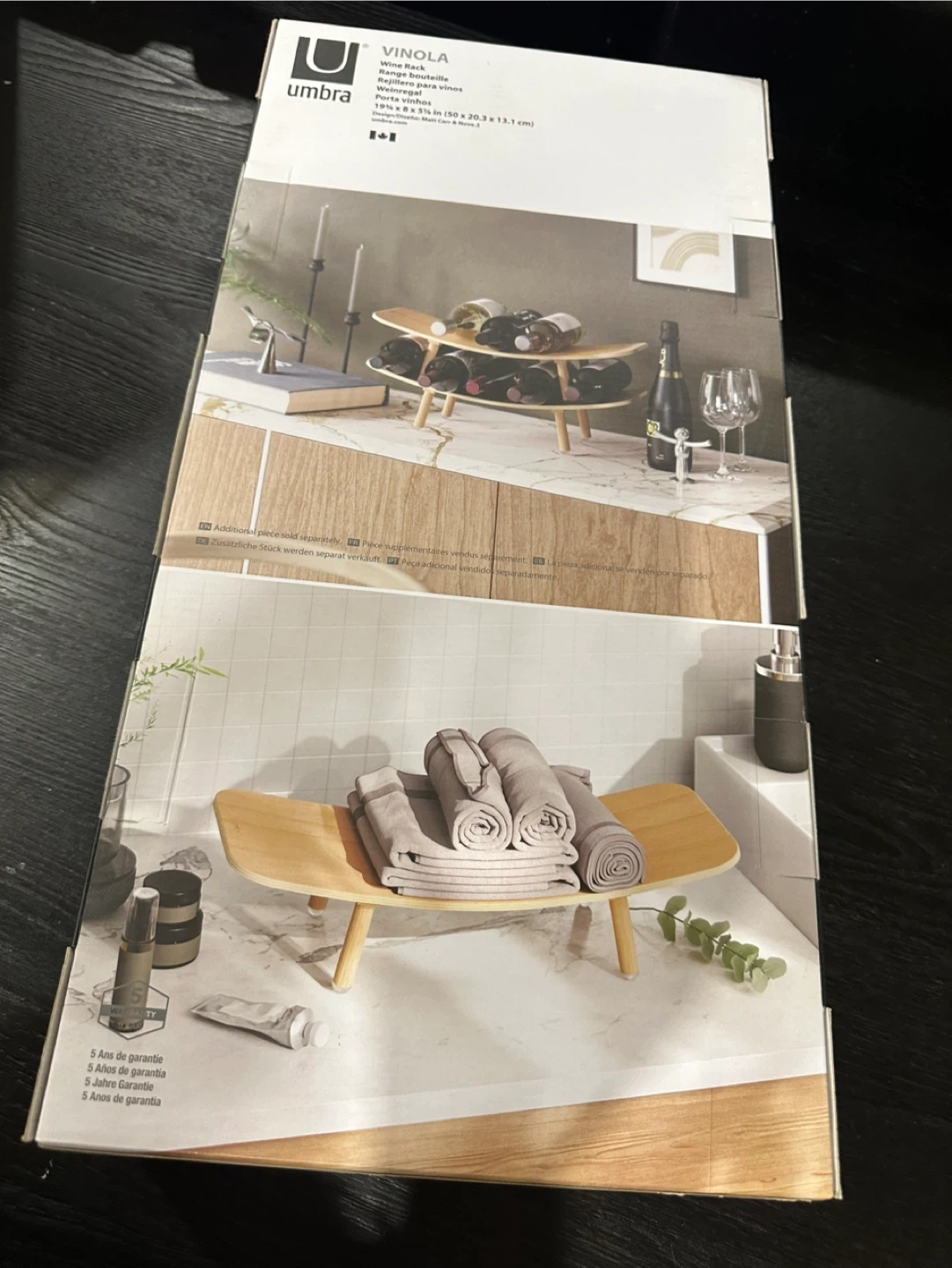 Selling a brand new Umbra Vinola Wine Rack! This rack is designed by Matt Carr & Nove.3. It measures approximately 19 3/4 x 8 x 5 1/8 inches (50 x 20.3 x 13.1 cm). It's still in its original packaging and ready for your home