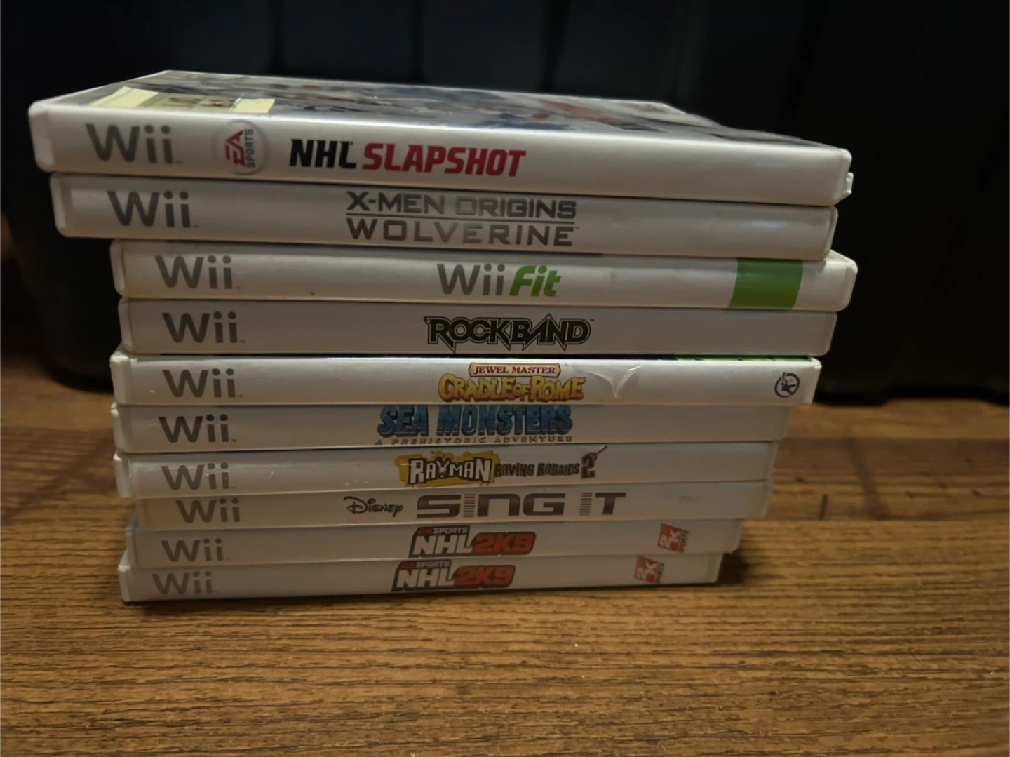 Big bundle of 10 Wii games here. Got a variety of titles. Games are: NHL Slapshot, X-Men Origins Wolverine, Wii Fit, Rockband, Jewel Master Cradle of Rome, Sea Monsters A Prehistoric Adventure, Rayman Raving Rabbids 2, Disney Sing It, and two NHL 2K9 games. Fun for anyone wanting some classic Wii action.