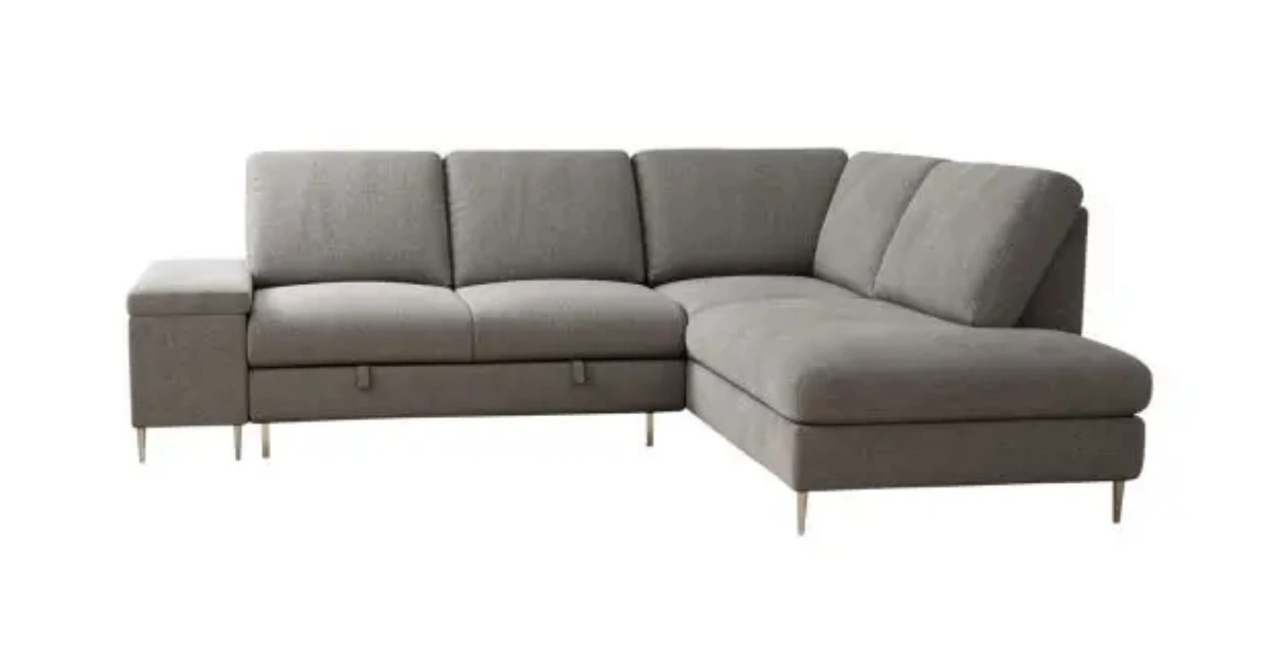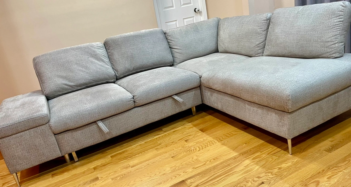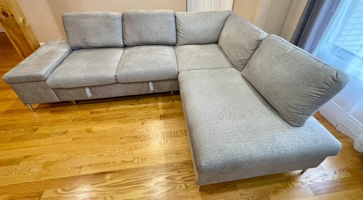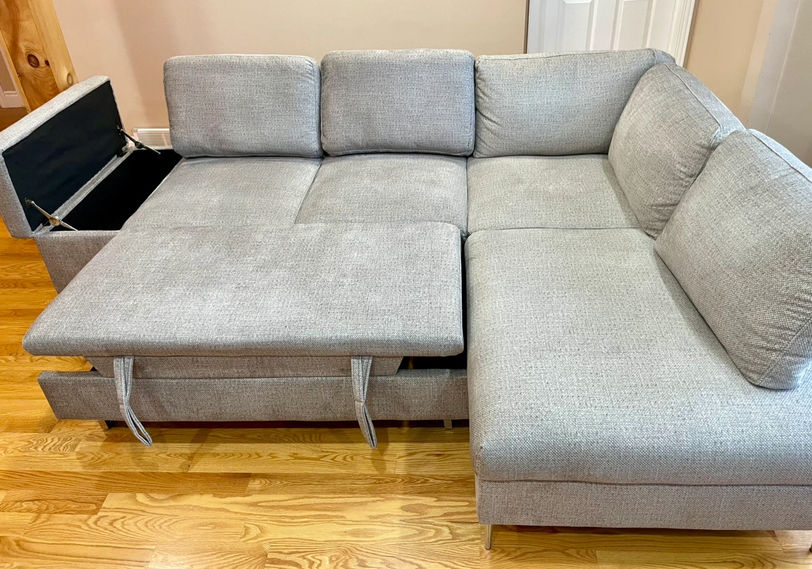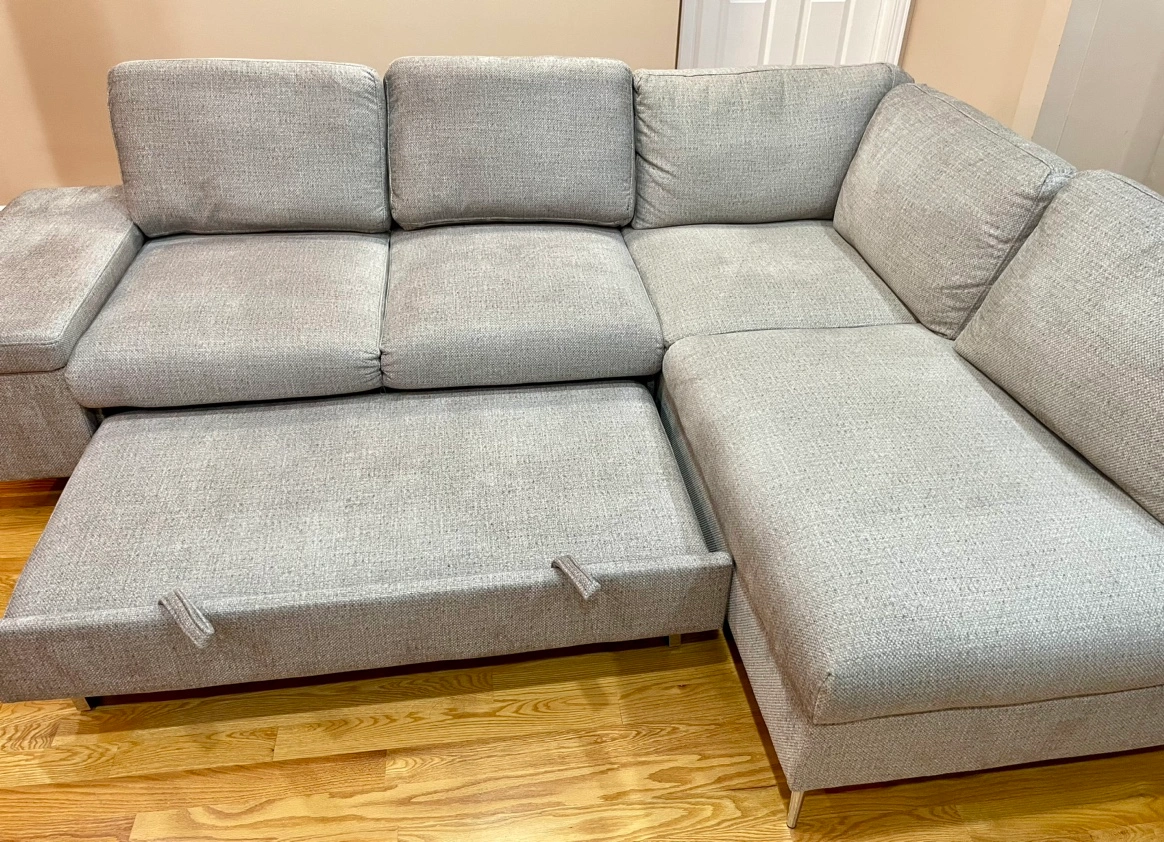 Moving out sale! This rare find contemporary style multi-functional room sectional features loose pillow backs, a pop-out sleep surface, storage inside the left arm and all wrapped up in a double shade silver grey soft touch fabric Used only for just a month - Absolutely no complaints, no stains, no dust and in perfect condition from a pet free and smoke free home Pick up from Kitchener