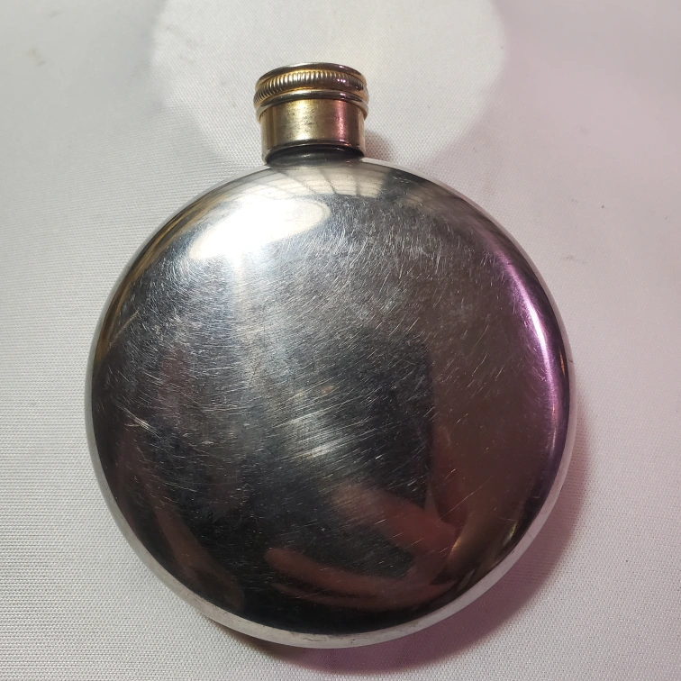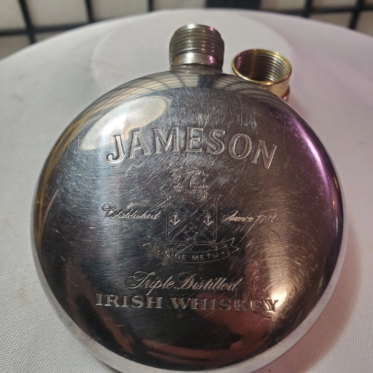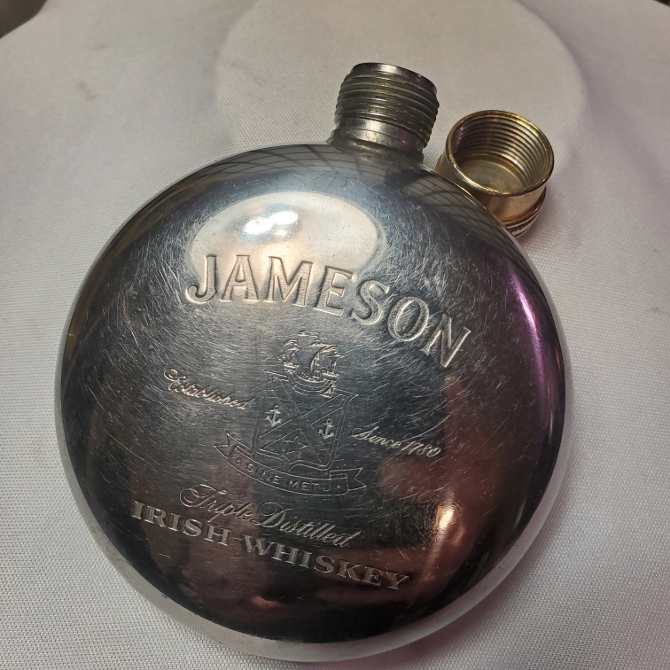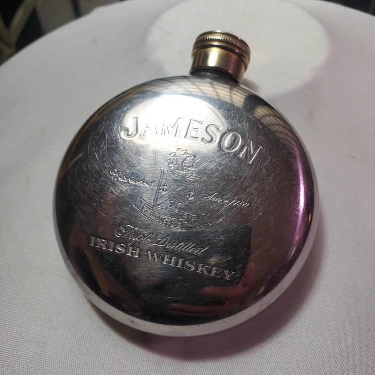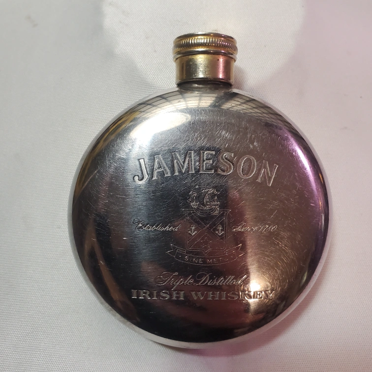 248This Vintage Jameson flask is perfect for any whiskey lover on the go. It's in good condition and ready to hold your favorite spirit. This flask has some wear and scratches. A great gift for a Jameson or whiskey lover! Vintage Jameson Irish Whiskey Round Coat Pocket Flask Silver Tone Engraved.