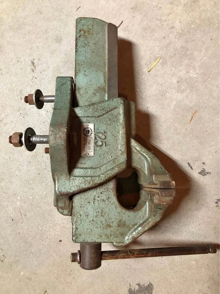 A odd vise to find here. FPU or Fabryka Przyrazow Uchwytow, Bison Bial made these and still produce a version. The rear jaw slides back on a set of gibs. Swivel base. Very strong and stout at 61 lbs. A high quality tool. Jaws are 5" wide.