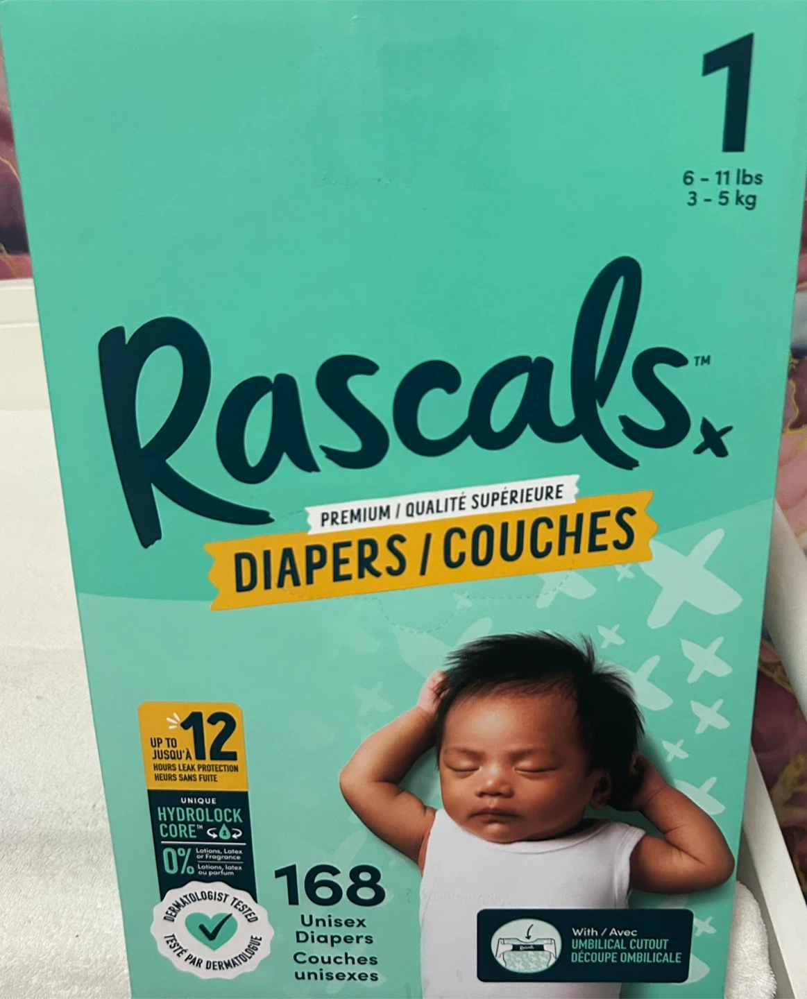 Selling a box of Rascals Premium Diapers, size 1. I used only 5.