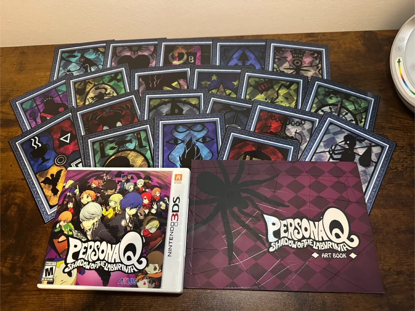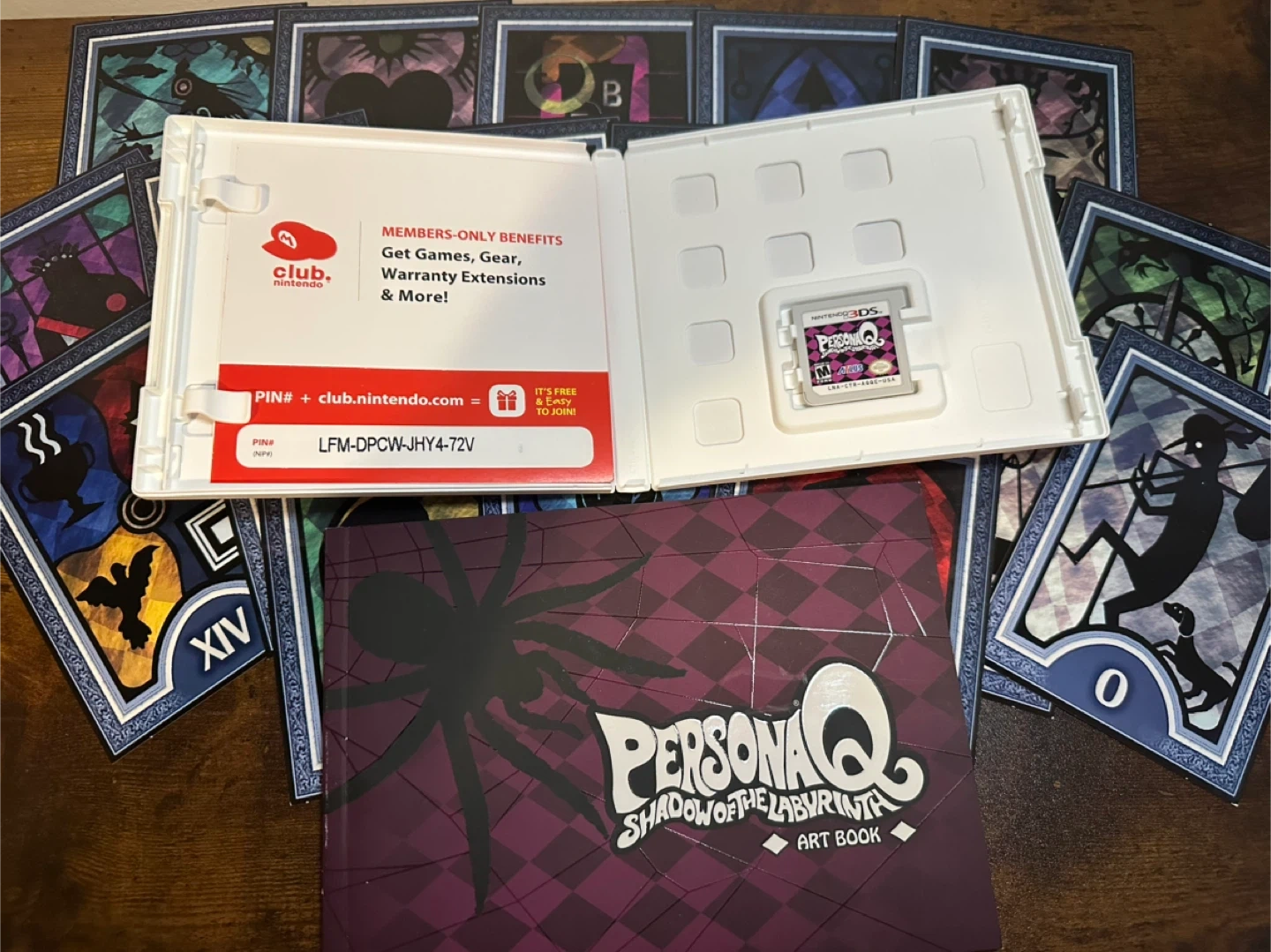 This bundle includes the PersonaQ Shadow of the Labyrinth 3DS game in the original case (sells for $50+), the art book (near perfect condition—just a tiny bit of wear on the edge of the spine), and the 20 tarot cards that came with the Wild Cards Premium Edition.