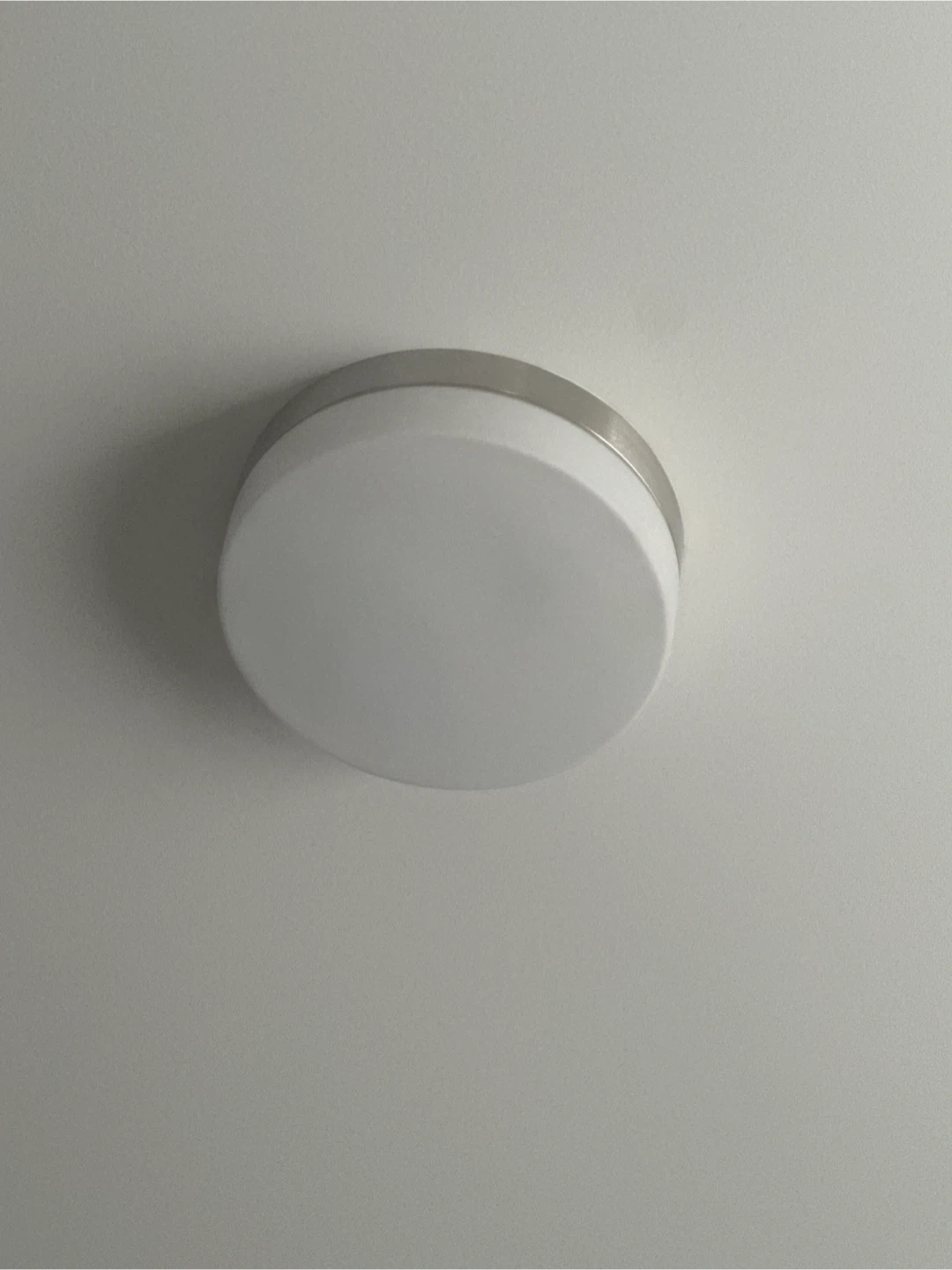 White circular flush mount ceiling light. It has a brushed nickel trim. This light provides a clean, modern look for any room. We have 7 lights.
