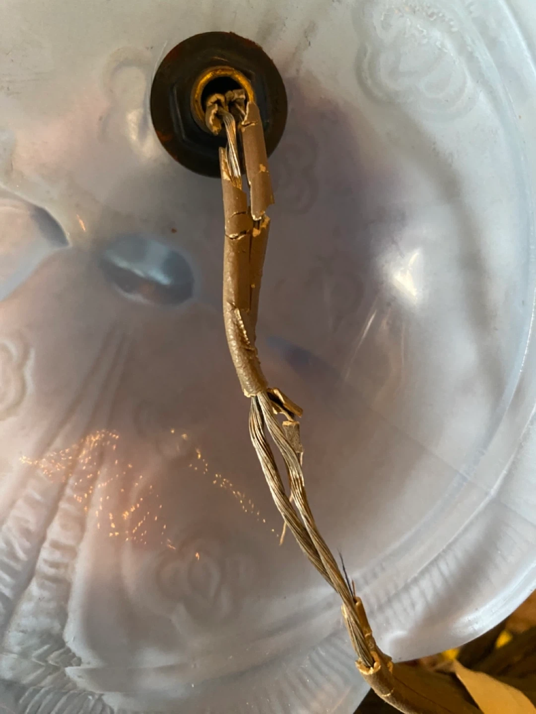 These are a pair of vintage blue glass lamps featuring figurine bases and detailed shades. The lamps have a unique art deco style with a frosted finish. Both lamps come with power cords, though one shows wear and tear on the wiring.