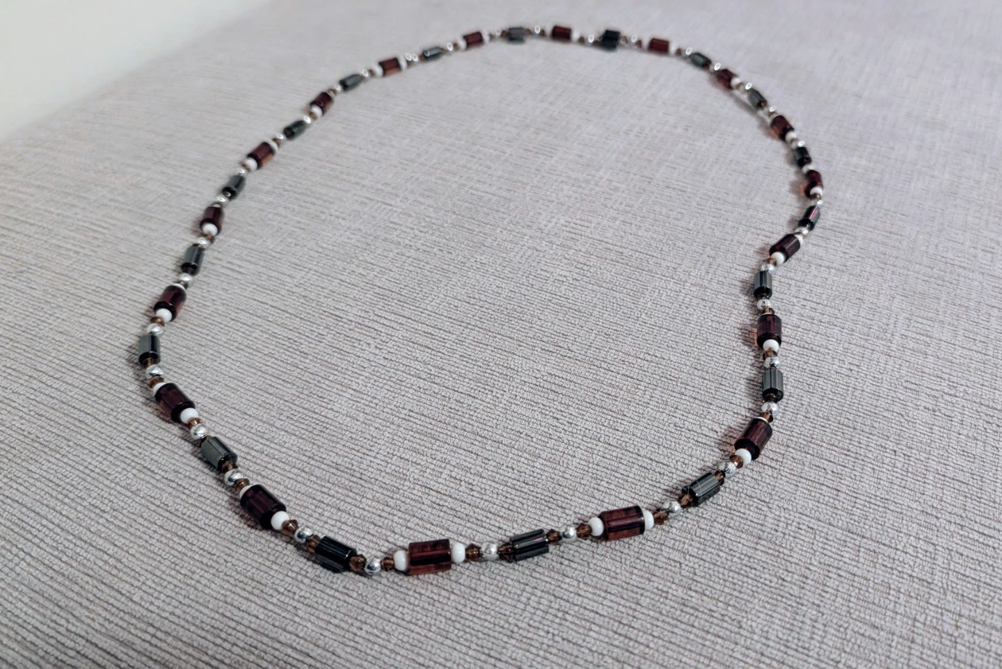 Selling a beaded necklace with a mix of brown, black, and silver beads. It's in new condition and would make a lovely addition to any outfit