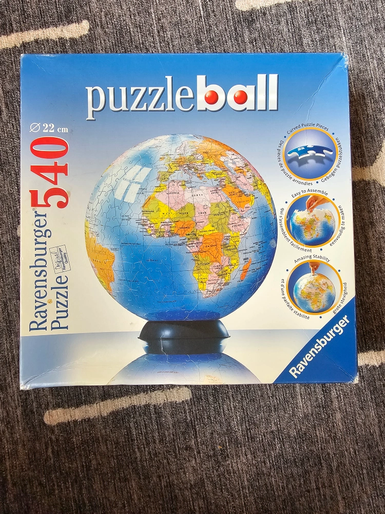 36Complete 340-piece Ravensburger Puzzleball. Curved puzzle pieces. Easy assembly. Amazing stability. Globe shaped puzzle.